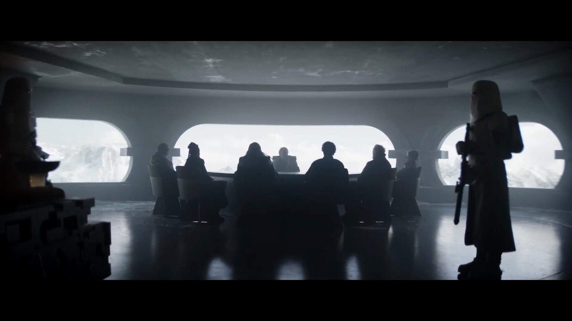 - Shot #22 - We fade in on a board-room table that brings to mind the one on the Death Star in the original Star Wars film, though this one appears to be on an ice planet.. Two Imperial snowtroopers stand guard on either side of the frame as a meeting is being held. One person sits at the head of the table and six others face him around the other side.