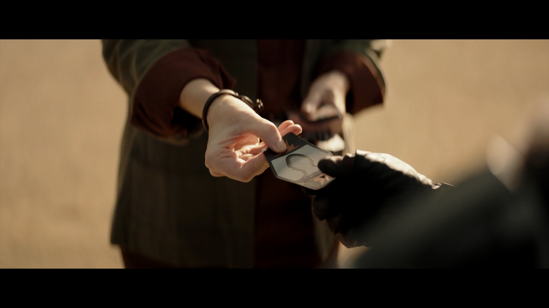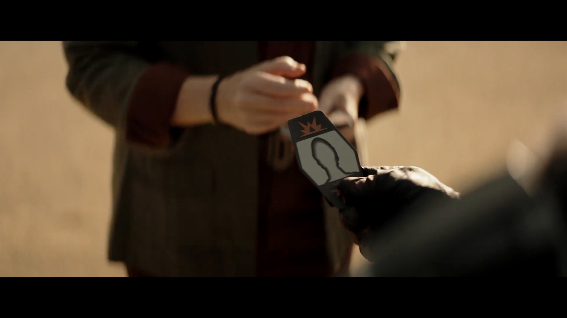 - Shot #24 - We see the hand of Colonel Ward from the previous trailer (played by Alien actress Sigourney Weaver) putting a card into the hand of Din Djarin. The card has a silhouette of a human head on it, but Mando's thumb covers any other details on the bottom.