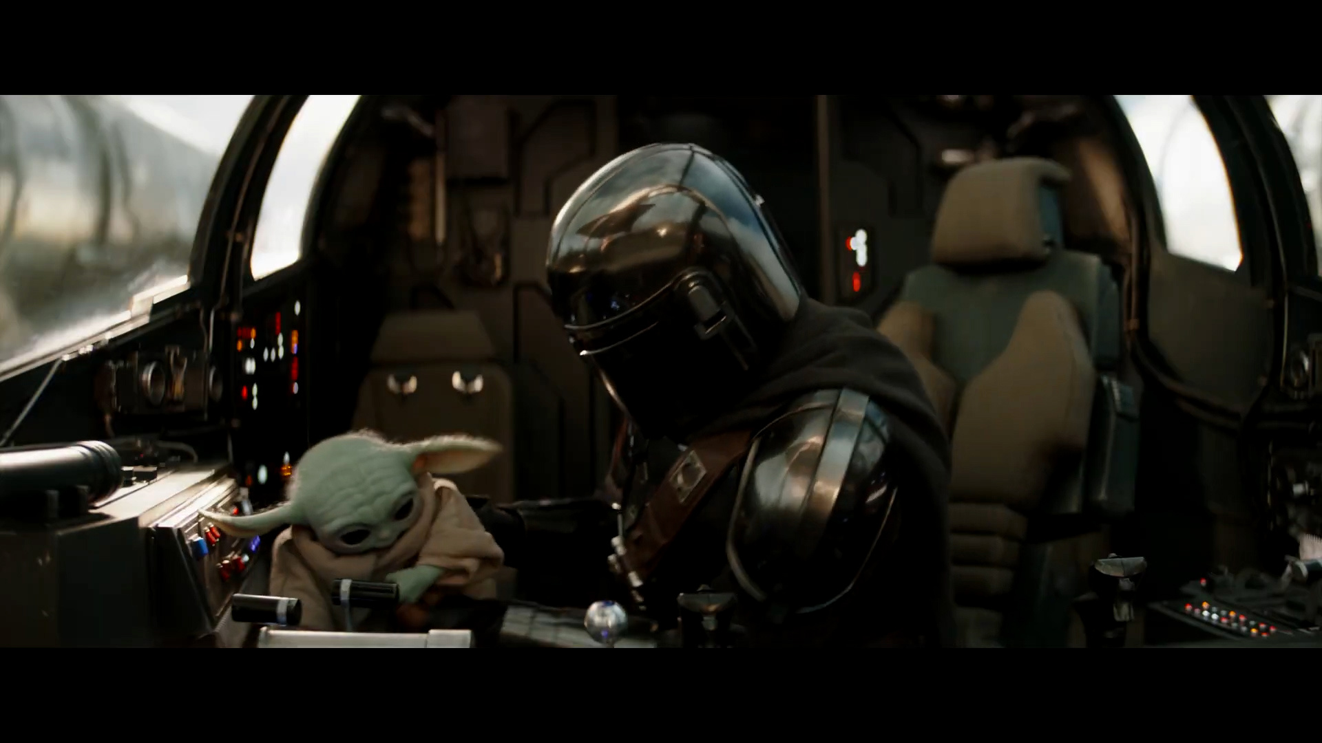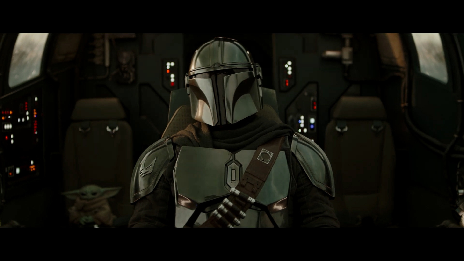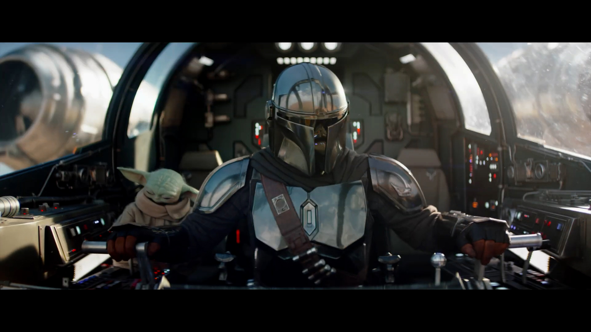 - Shot #38 - Mando pilots the Razor Crest, with Grogu once again seated behind him.