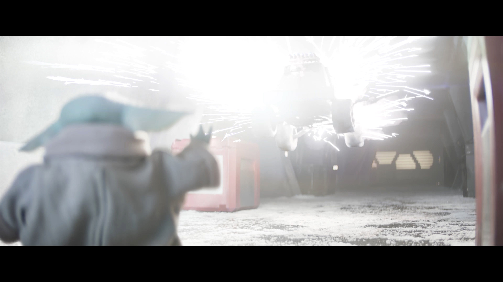 - Shot #32 - Medium shot of Grogu as he concentrates through the Force, and then opens his eyes as a flash happens off-screen.