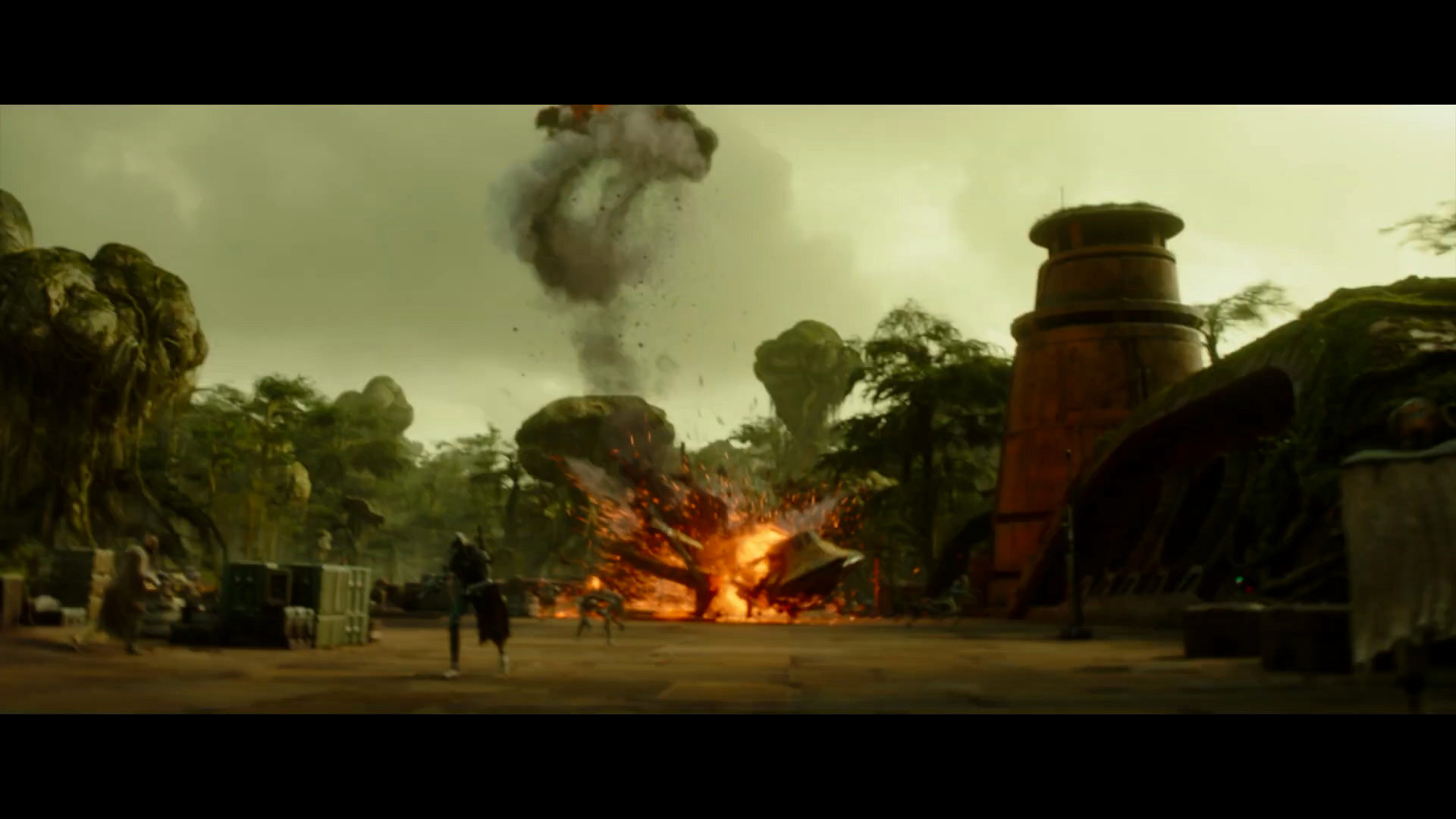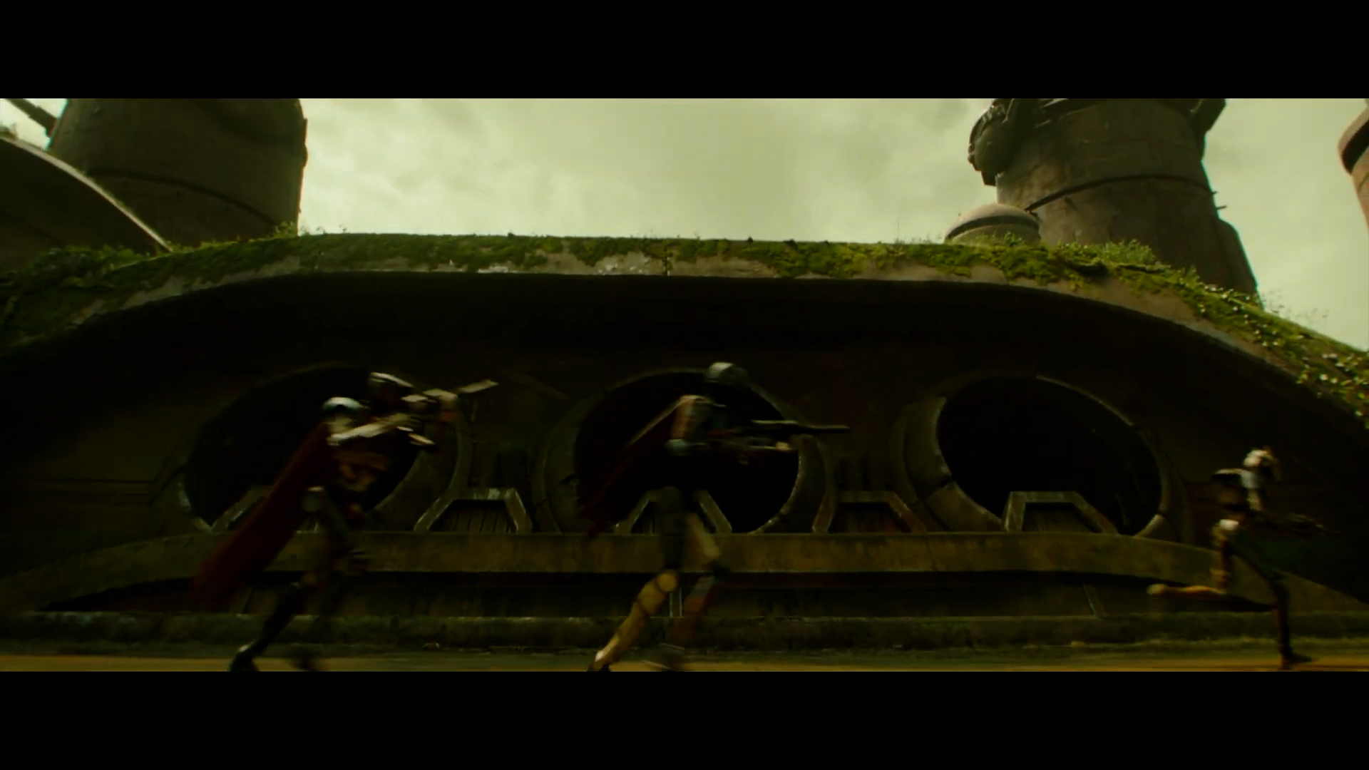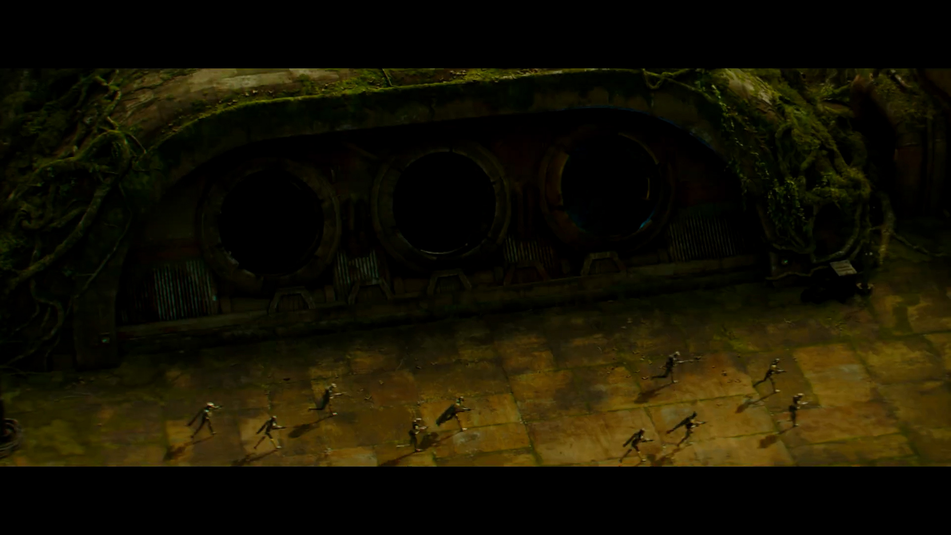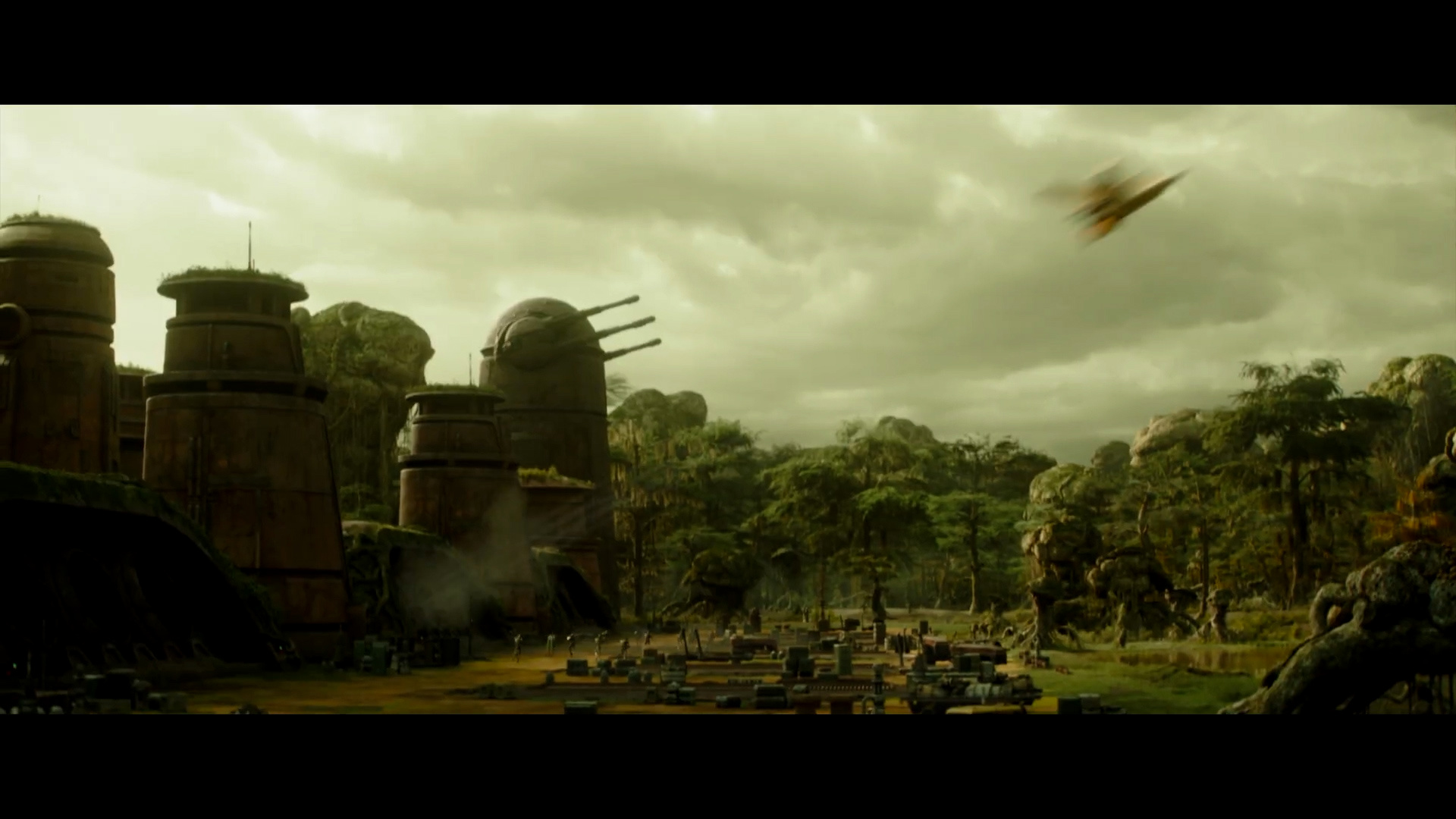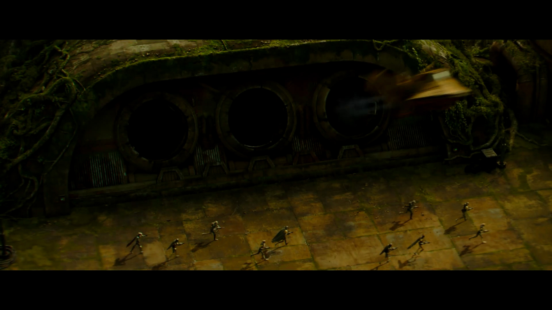 - Shot #36 - Wider aerial shot of the same complex with the droid soldiers running toward the right side of the frame. We can see that vines grow on the side of the building. A ship erupts at high speed from one of the three holes that were unveiled by the lowering door.