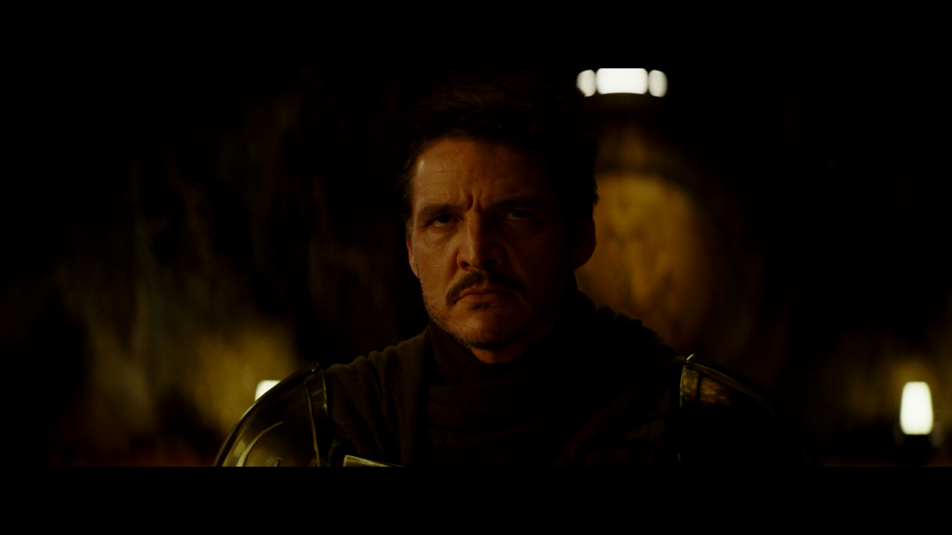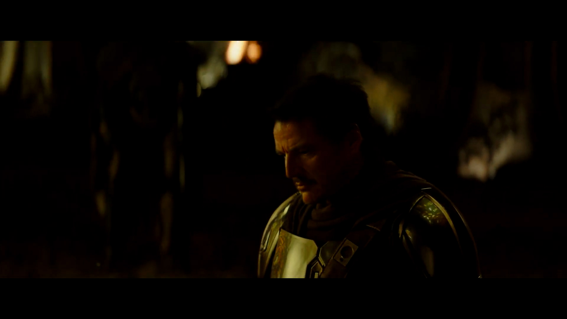 - Shot #42 - A hand belonging to one of the droid soldiers removes the helmet from Din Djarin's head, revealing Pedro Pascal's face. Mando appears to be kneeling in this shot, likely having been captured and restrained. He does not look happy.