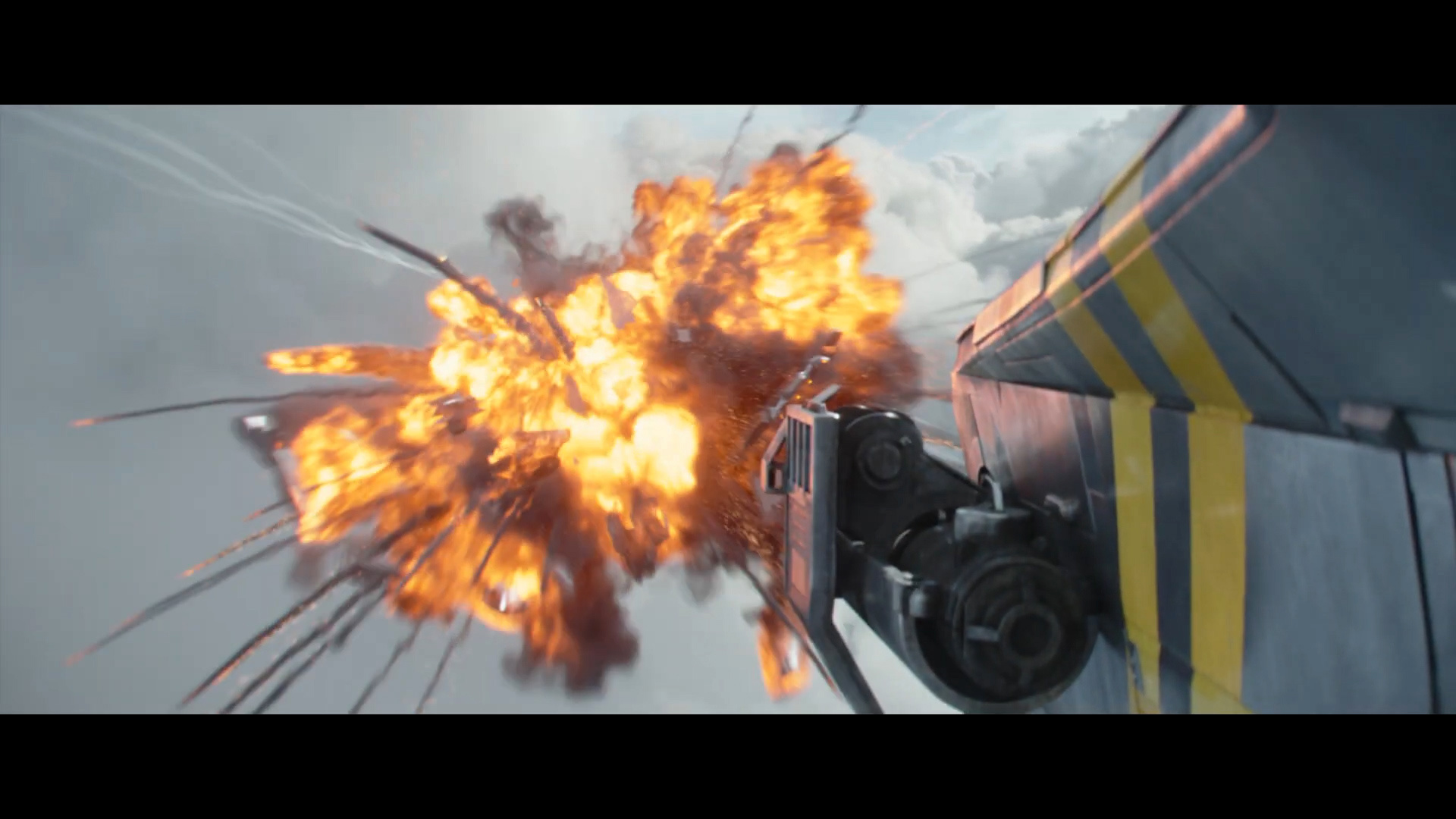 - Shot #50 - Something explodes in the sky ahead of us as the camera, attached to the side of the Razor Crest, flies through the explosion.