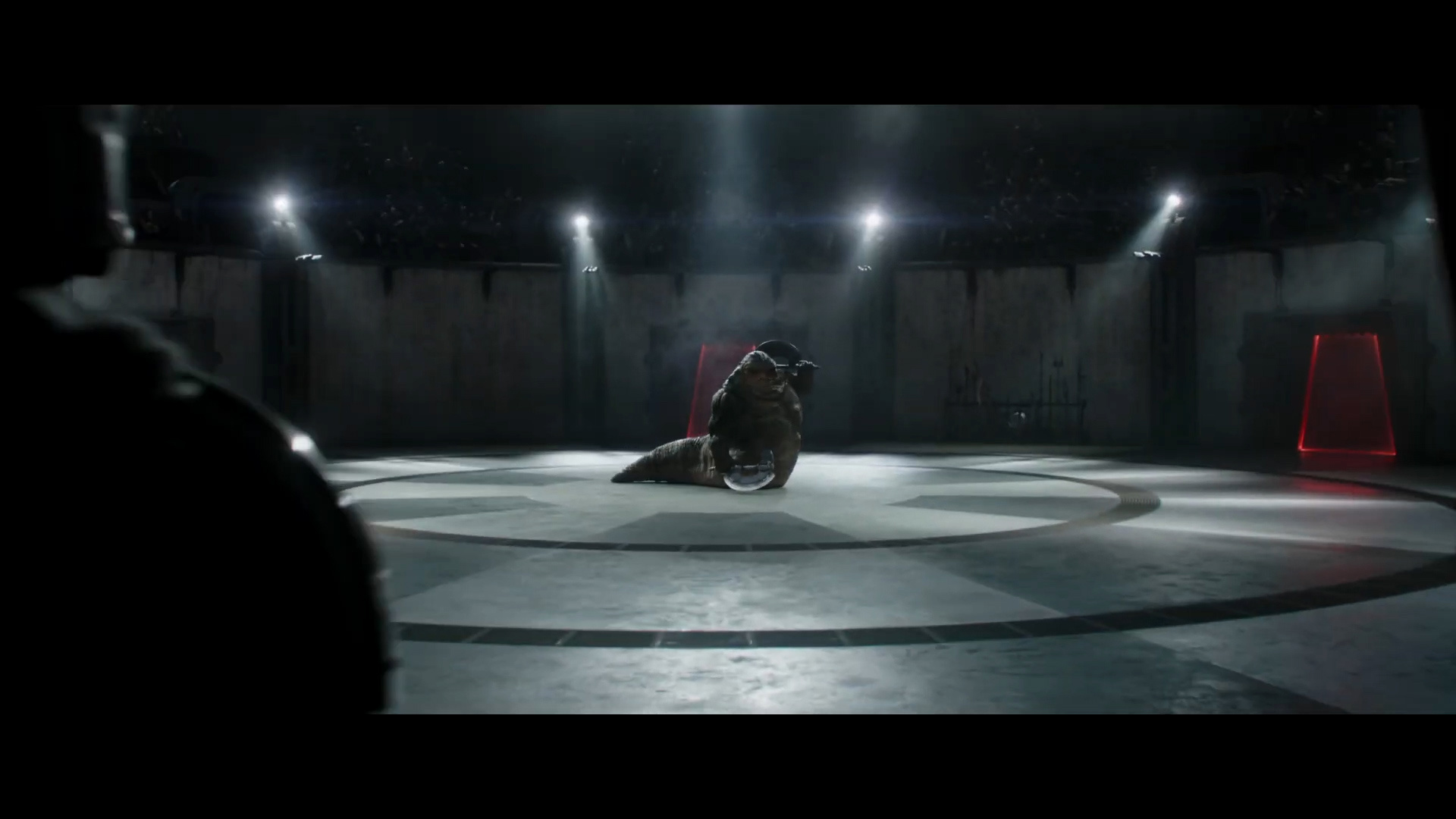 - Shot #56 - Wide shot in an arena on what others have theorized to be the Smugglers' Moon of Nar Shadda, which orbits Nal Hutta. That's Rotta the Hutt in the center of the frame, who is being voiced by Jeremy Allen White from FX's The Bear.