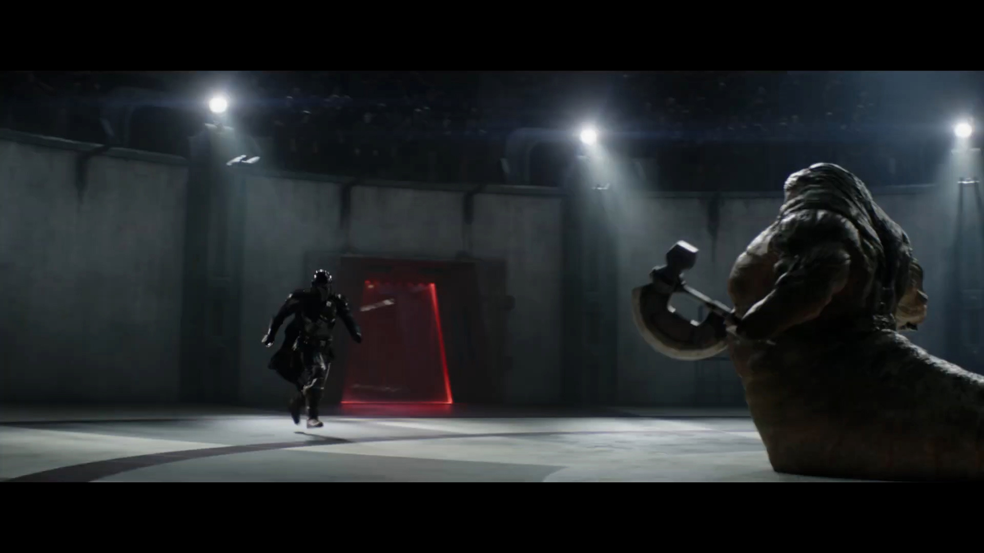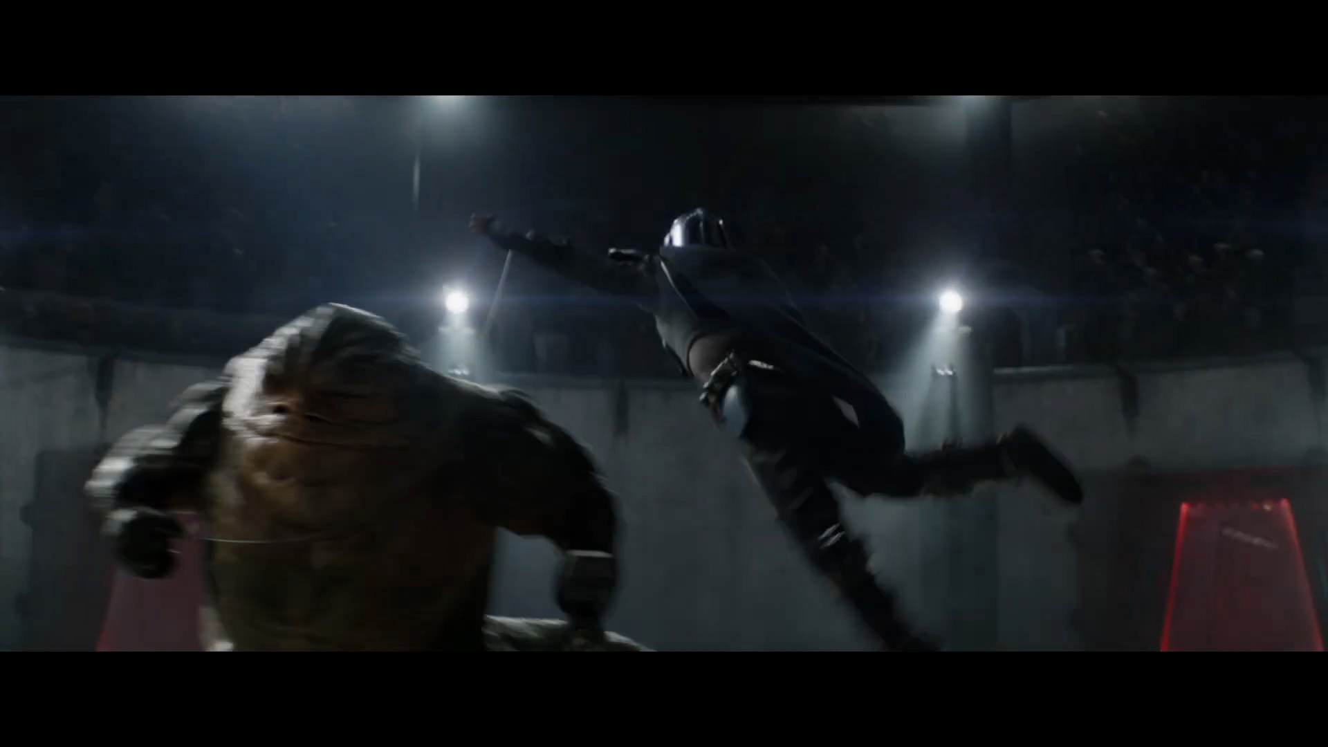 - Shot #57 - Reverse of the previous shot, as Mando runs toward Rotta in the arena. The crowd roars as the two combatants battle each other with axe and grappling hook.