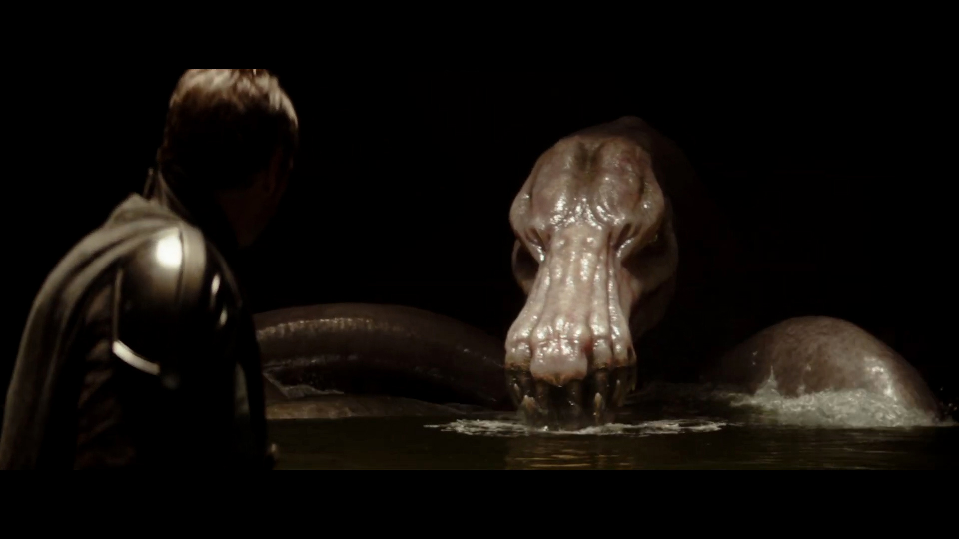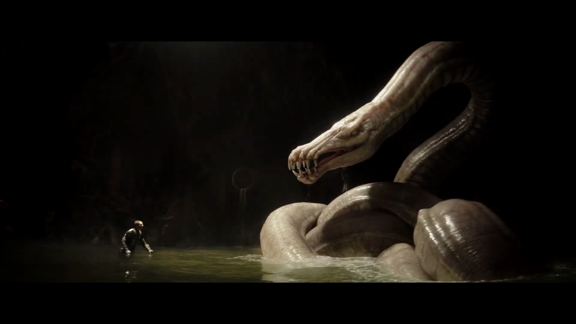 - Shot #63 - Wide shot from the side showing the size comparison between Mando and the dragonsnake, which we see is an albino. My guess is that the Hutt Twins feed their prisoners to this creature, much like their cousin Jabba did with his pet rancor.