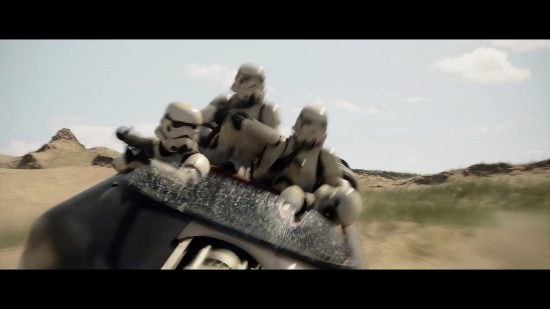 - Shot #67 - A speeder carrying four stormtroopers flips over after a blaster shot rings out, sending the troopers flying. The planet looks arid and rocky, though there is some grass as well. Hard to say where this might be.