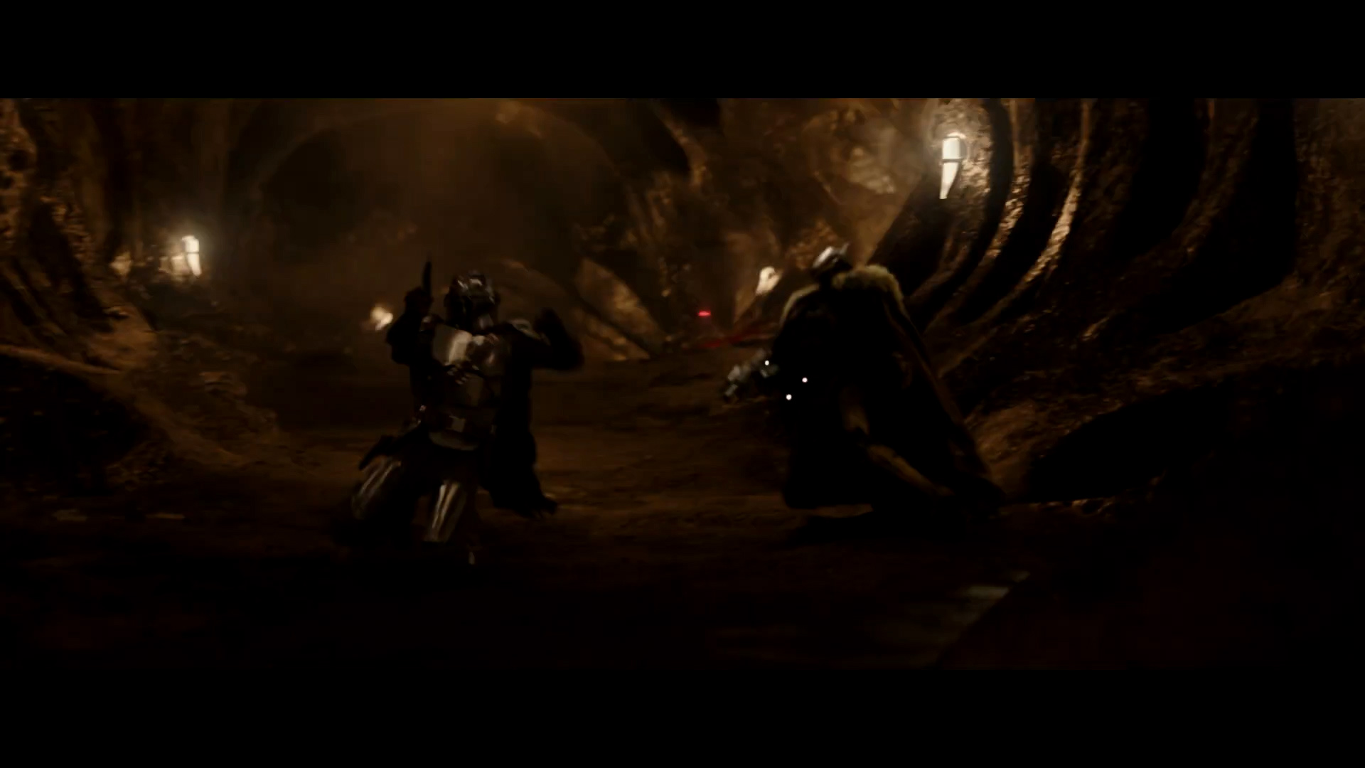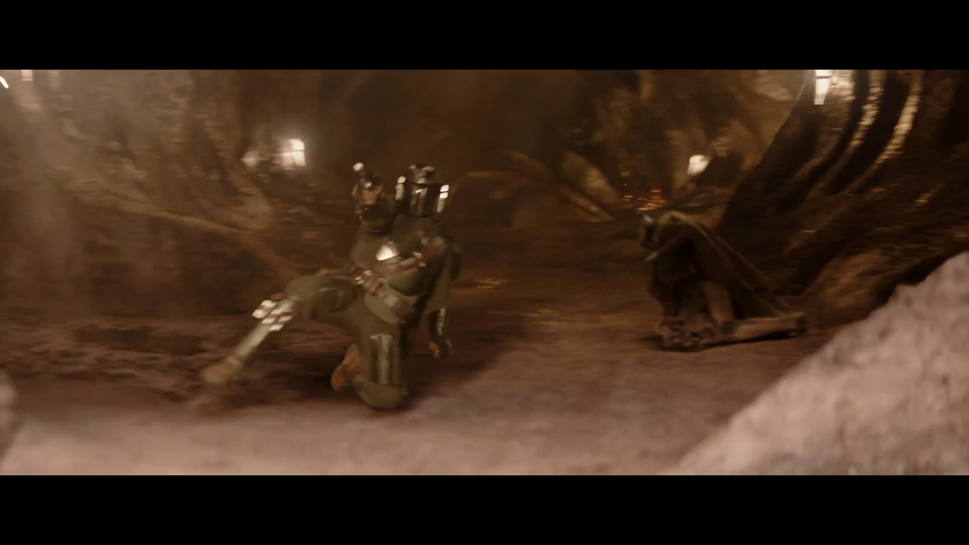 - Shot #69 - In a dungeon or tunnel, probably at the Hutt's lair, Mando slides along the ground firing his blaster as one of the droid soldiers collapses behind him.