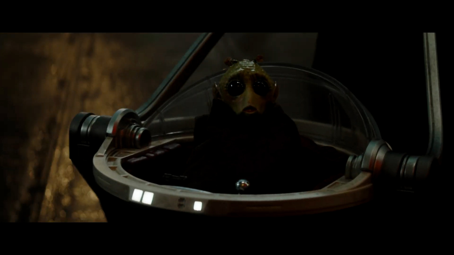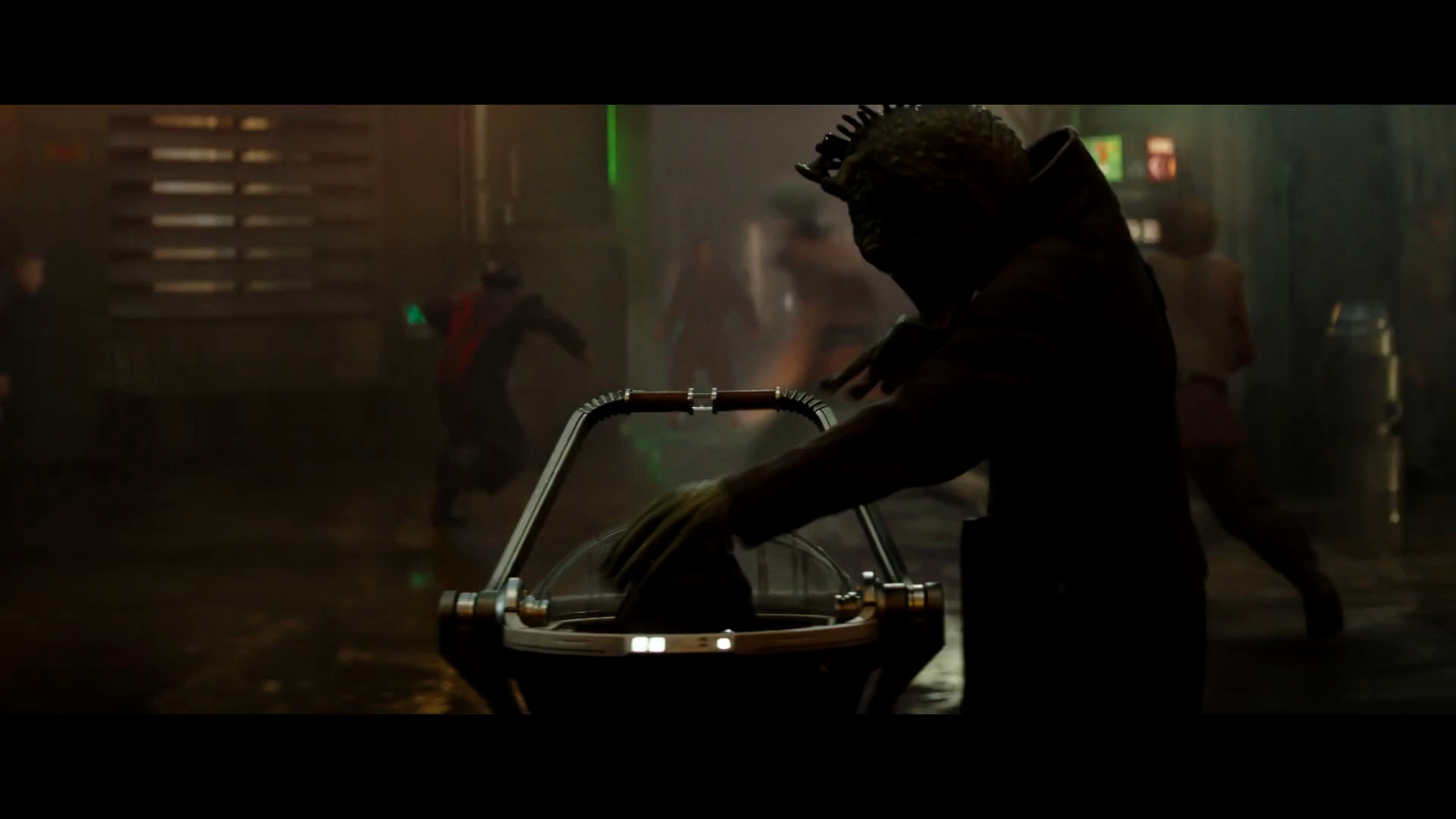- Shot #73 - The Rodian's mom grabs the baby and flees, leaving the hover-pram unattended as other aliens run panicked in the background.