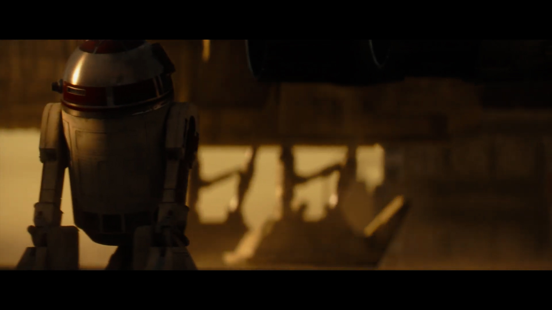 - Shot #2 is of the landing gear of a ship (most likely the Razor Crest) on an airfield as an astromech droid rolls into frame making a familiar bleeping noise. Note that this droid has red markings on its dome instead of blue, meaning that it is not R2-D2 but a similar-model R-series droid.