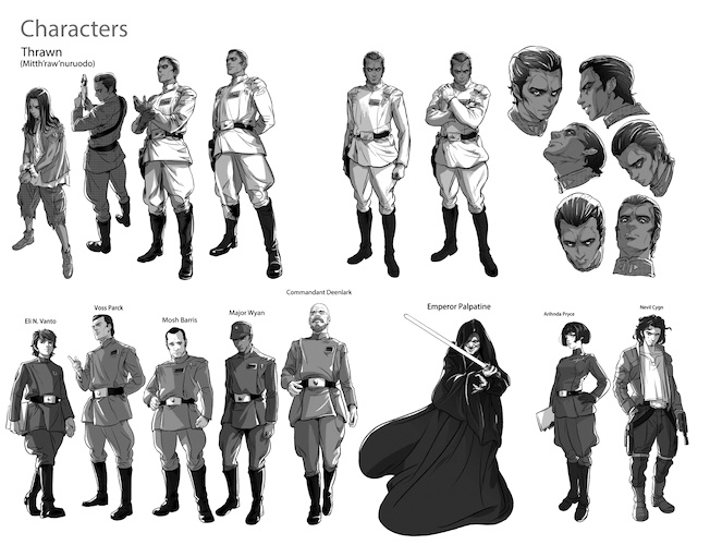 Above are character designs and process pages for Star Wars: Path of the Lightsaber, while below you can see finished sample interiors from the highly anticipated new book.