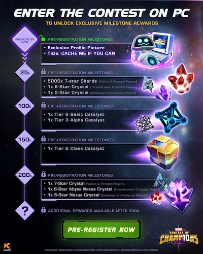 - Pre-registration for Marvel Contest of Champions on PC is now open, which will give players unlockable, exclusive milestone rewards when you play the game on PC.