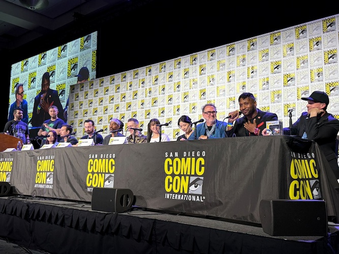 Appearing on stage were Alpha Takahashi (Psylocke), Daniel Marin (Namor), Eliah Mountjoy (Winter Soldier), James Mathis III (Black Panther), Jordan Reynolds (Adam Warlock), Xanthe Huynh (Dagger), and Jon Bailey (Jeff the Land Shark). They were later joined by Crystal Lee, the newly announced voice of Jean Grey/Phoenix, Michael Scott (Knull), and Ian James Corlett (Mr. Fantastic), whose arrival sparked cheers from Fantastic Four fans attending Comic-Con just days after the movie’s release.