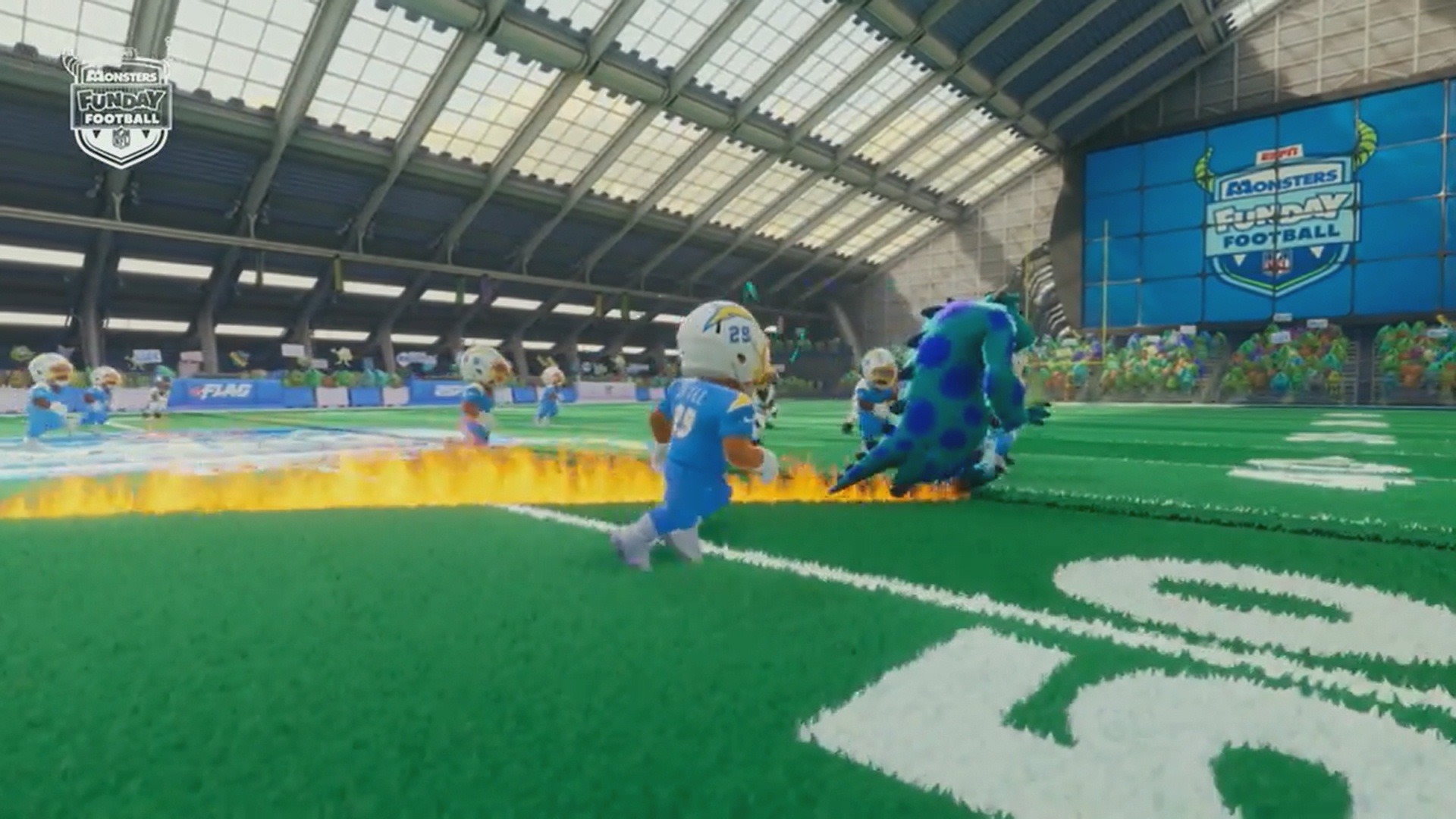 Monday night’s alt-cast of the Los Angeles Chargers and the Philadelphia Eagles football game brought the NFL action to Monstropolis, with ESPN’s Drew Carter and Dan Orlovsky transformed into monster broadcasters. Cheer canisters lined the field as fans powered them up with their cheers, echoing the Monsters, Inc. energy system and feeling a bit like the Laugh Floor at Magic Kingdom.