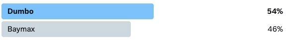 Before we get into our next matchup, let’s take a look at the last result. We have a real… um… Cinderella story going on here. Dumbo has pulled another upset, taking 54% of the vote to get past Baymax and claim the first spot in the Final 4. Will this magical run continue?