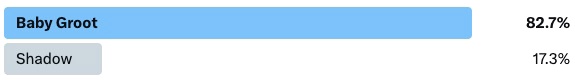 Before we get into our next matchup, let’s take a look at the last result. Our final opening round matchup was our most one-sided yet. Baby Groot proved to be a serious contender in this tournament, taking nearly 83% of the vote against Shadow. The Homeward Bound star simply didn’t have the name recognition to compete against a character as adorable and recognizable as Baby Groot.