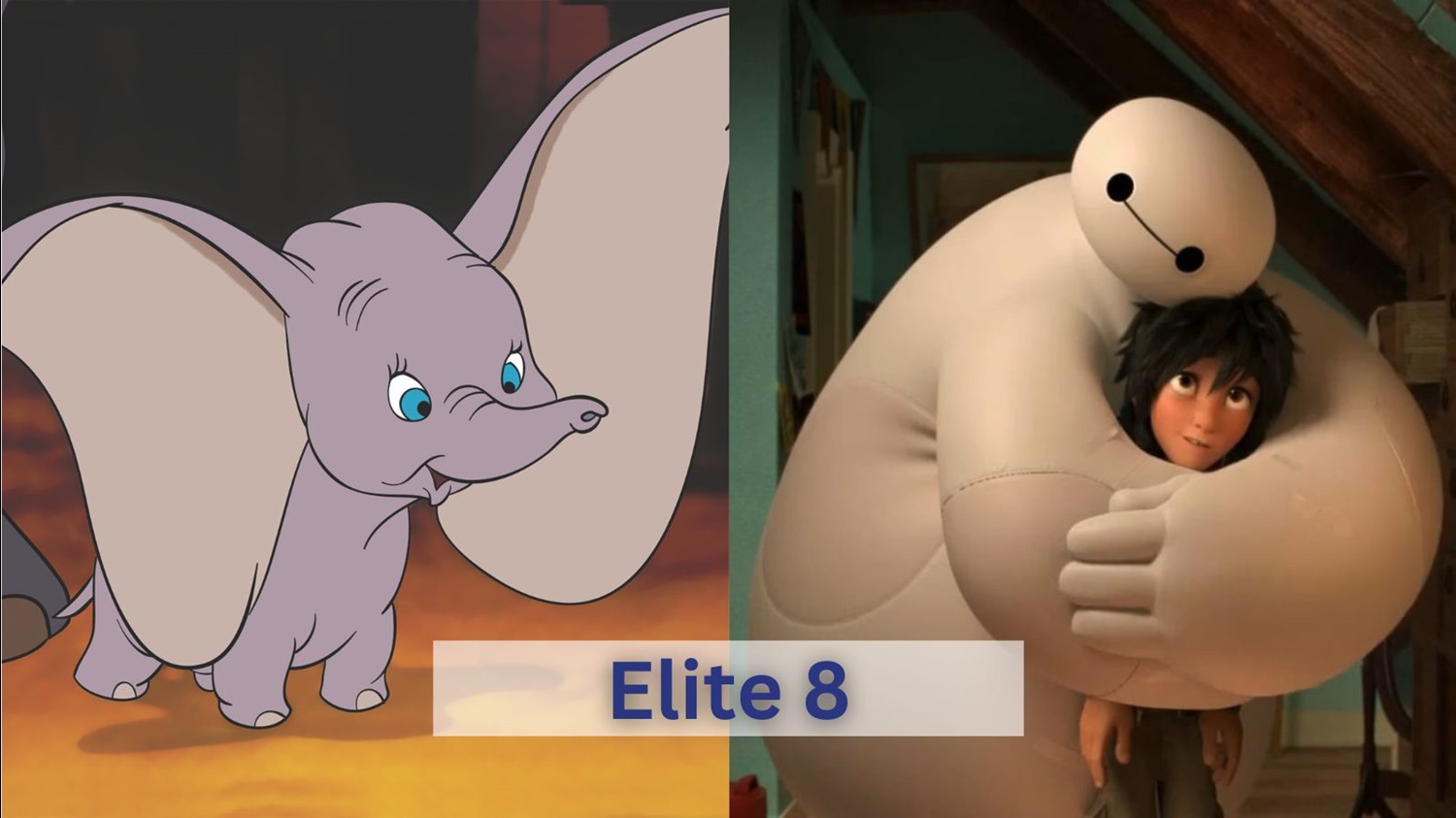 Now, we get into the second round of this tournament - the Elite 8. We’ll start in the Disney Animation region where Dumbo will face off with Baymax. The endearing elephant kicked off this tournament with a bit of a shock by upsetting Stitch to get to this round. Baymax defeated Baby Moana to advance to the Elite 8. Only one of these character can move on to the Final 4, though, and it’s a tough choice to make.