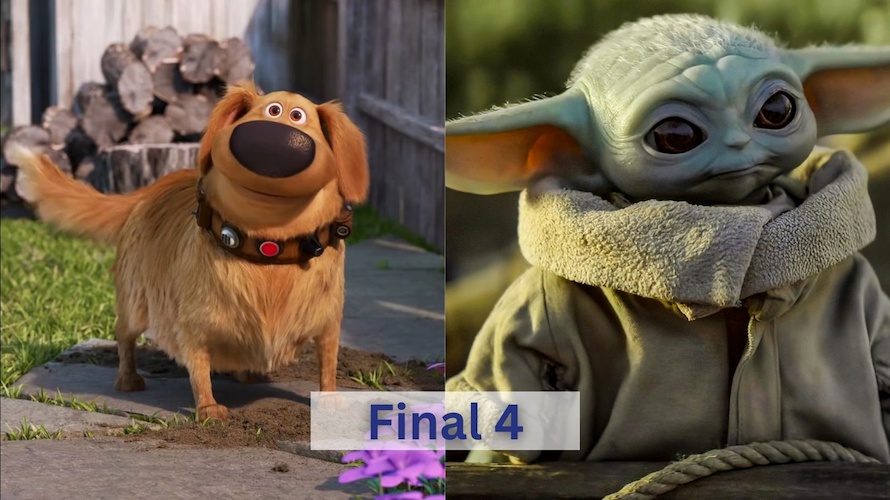 Our second Final 4 matchup pits the winner of the Pixar region against the winner of the Live Action region. Dug defeated Baby Dory and upset Boo to reach this round while Grogu won easily against Bean Bunny before eliminating Baby Groot. Grogu might just be the favorite in this whole tournament but everyone loves a talking dog!