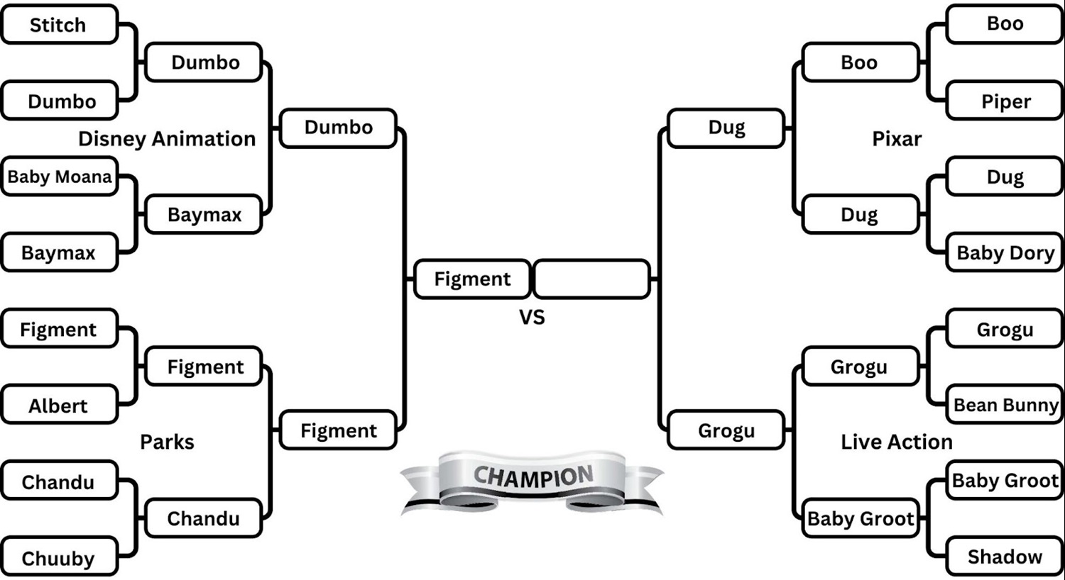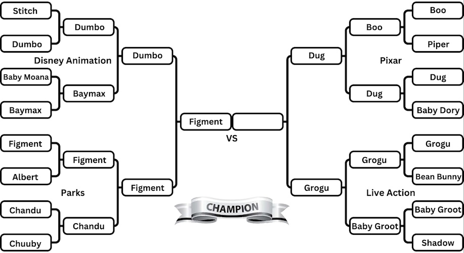 Our second Final 4 matchup pits the winner of the Pixar region against the winner of the Live Action region. Dug defeated Baby Dory and upset Boo to reach this round while Grogu won easily against Bean Bunny before eliminating Baby Groot. Grogu might just be the favorite in this whole tournament but everyone loves a talking dog!