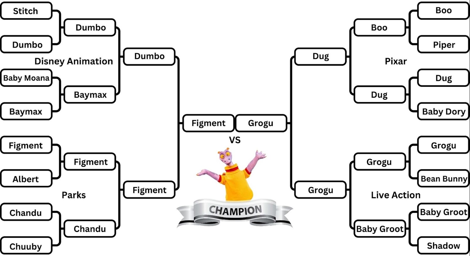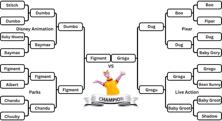 It was a close one, but Figment defeated Grogu, taking about 55% of the vote. The iconic and mischievous little dragon narrowly got past the little Star Wars critter and has now been crowned the cutest Disney character! It was a somewhat surprising result for our tournament, but it seems the popularity that comes with being the icon of a beloved park like EPCOT is enough to earn the votes.