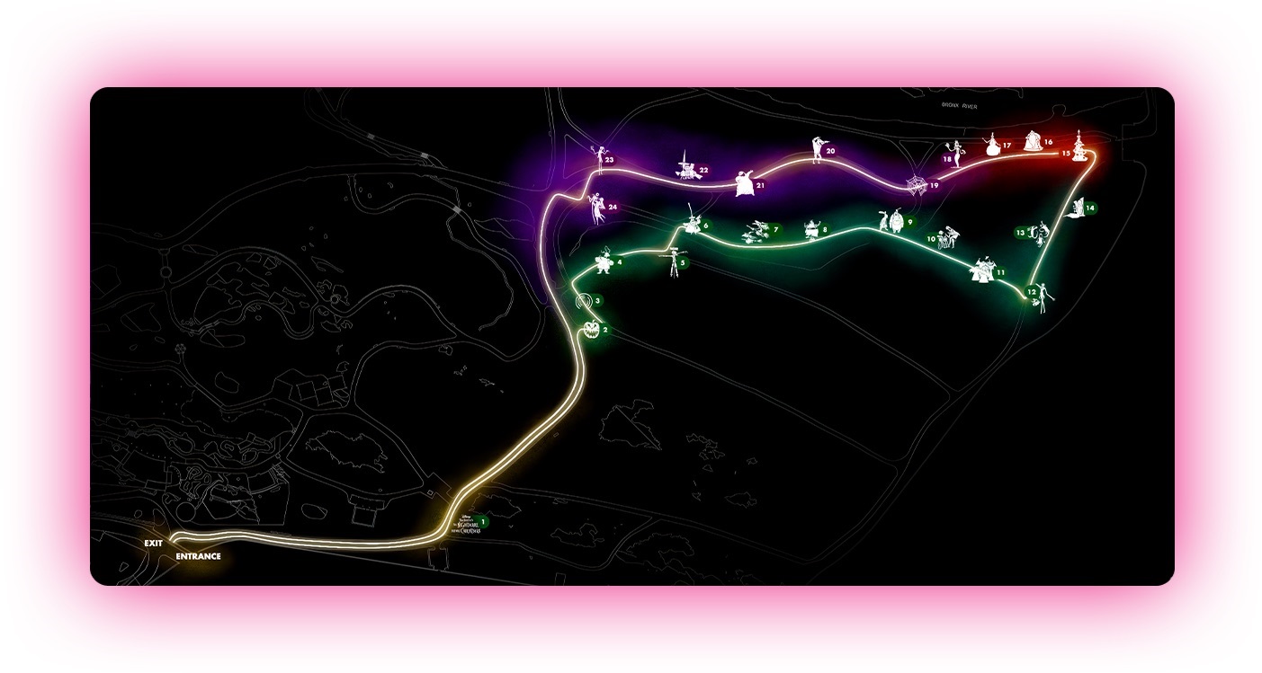- Tim Burton’s The Nightmare Before Christmas Light Trail takes place Wednesdays through Sundays from dusk until 10:00 p.m., and the whole experience takes 45-60 minutes.