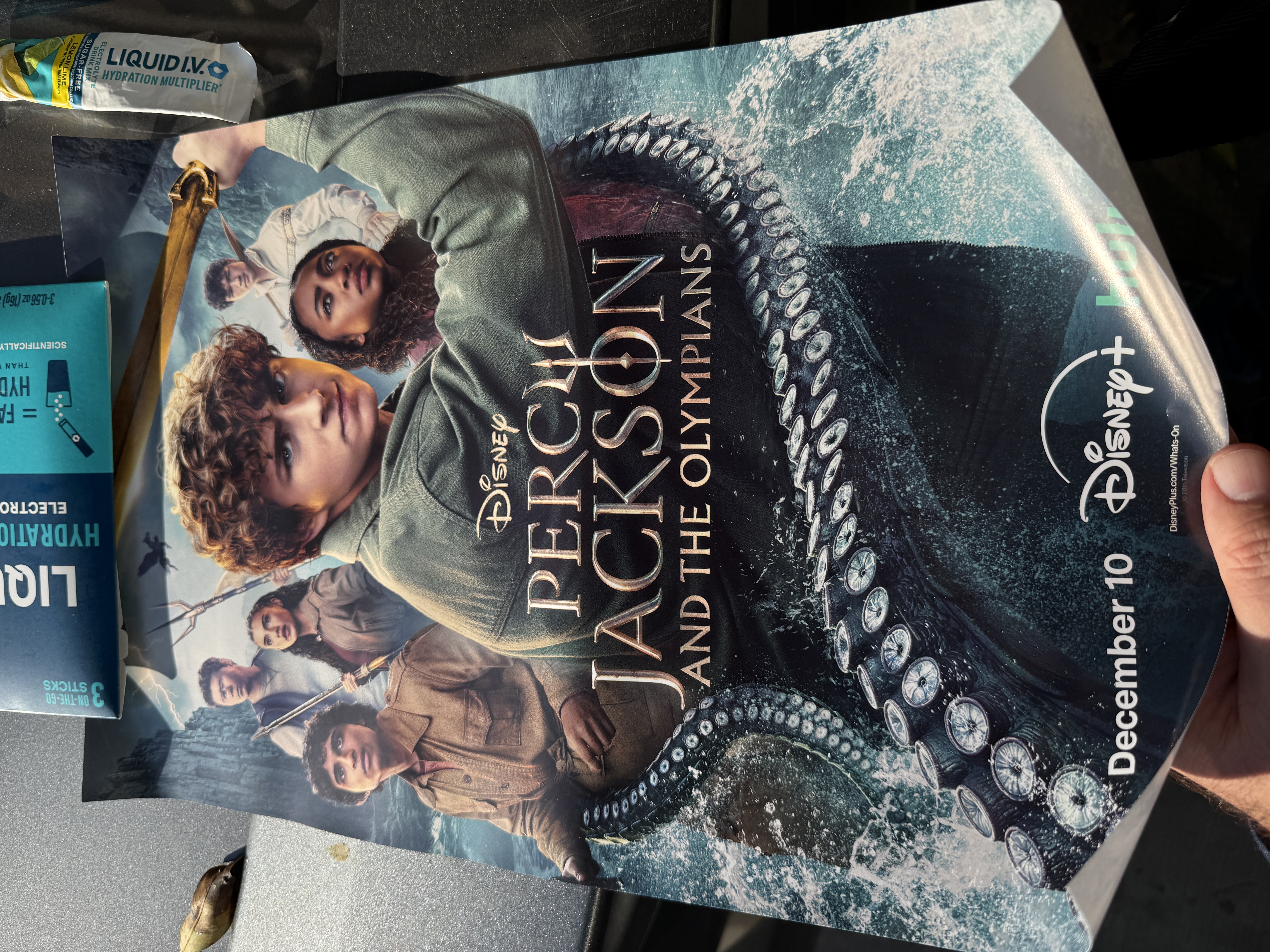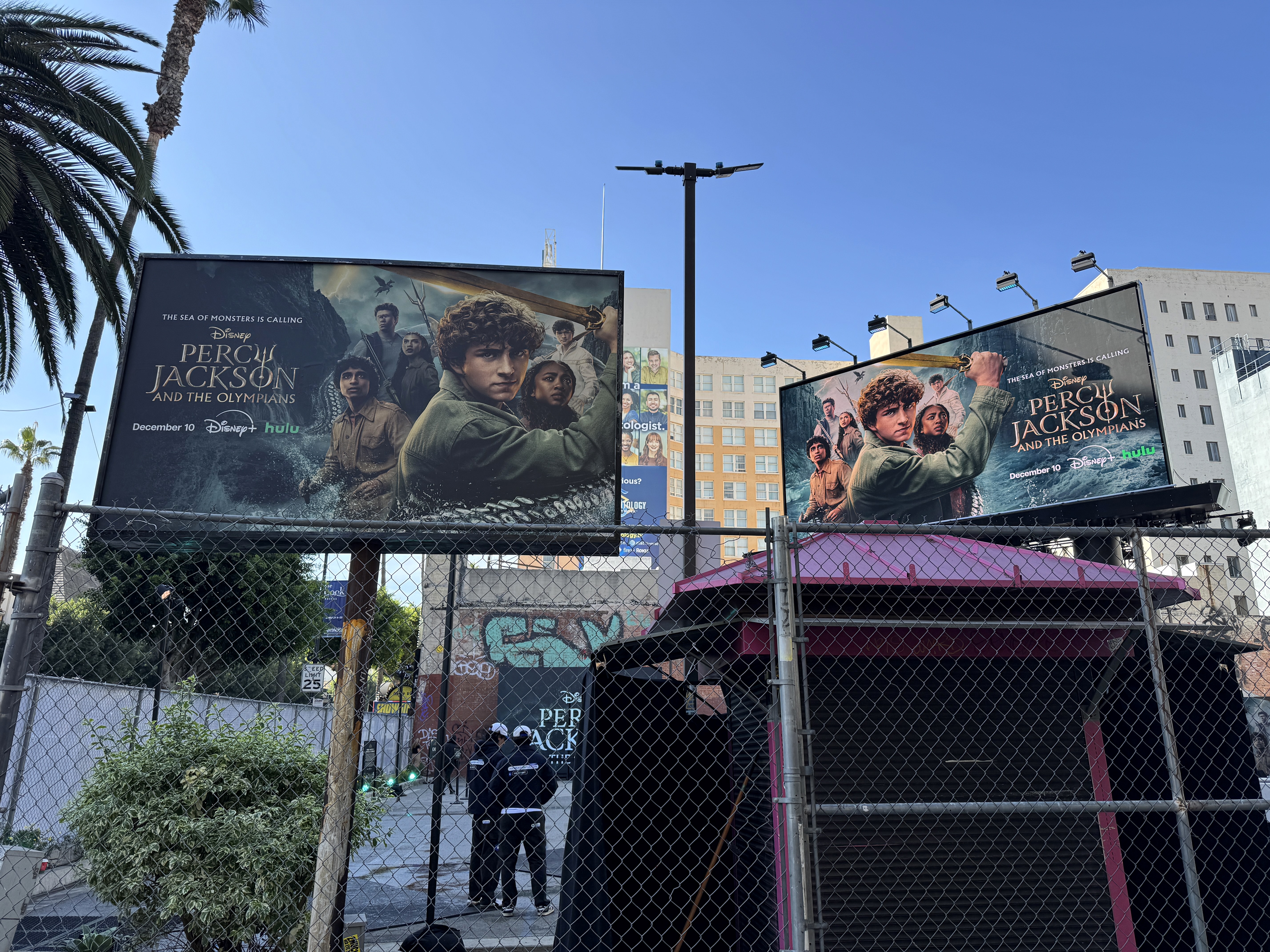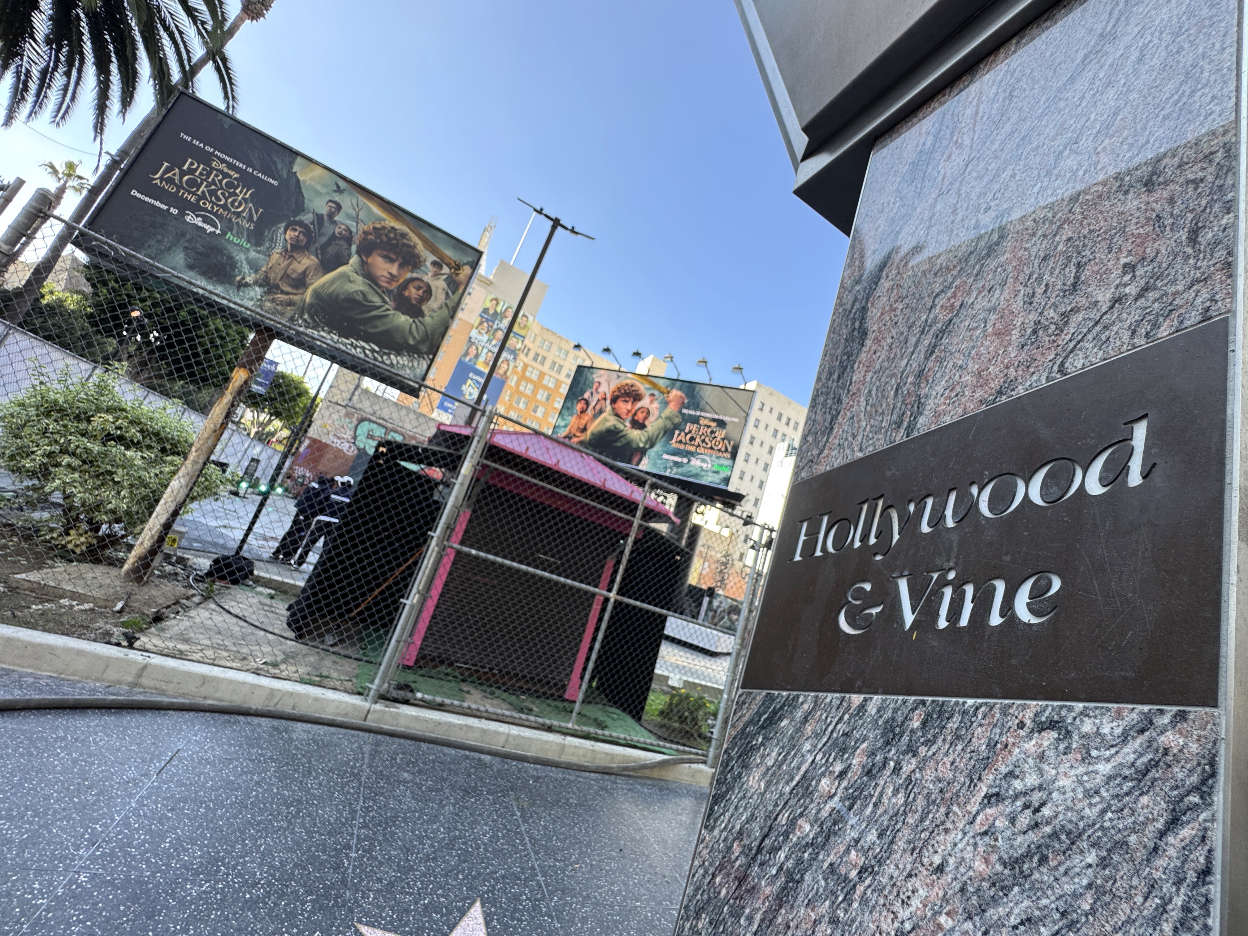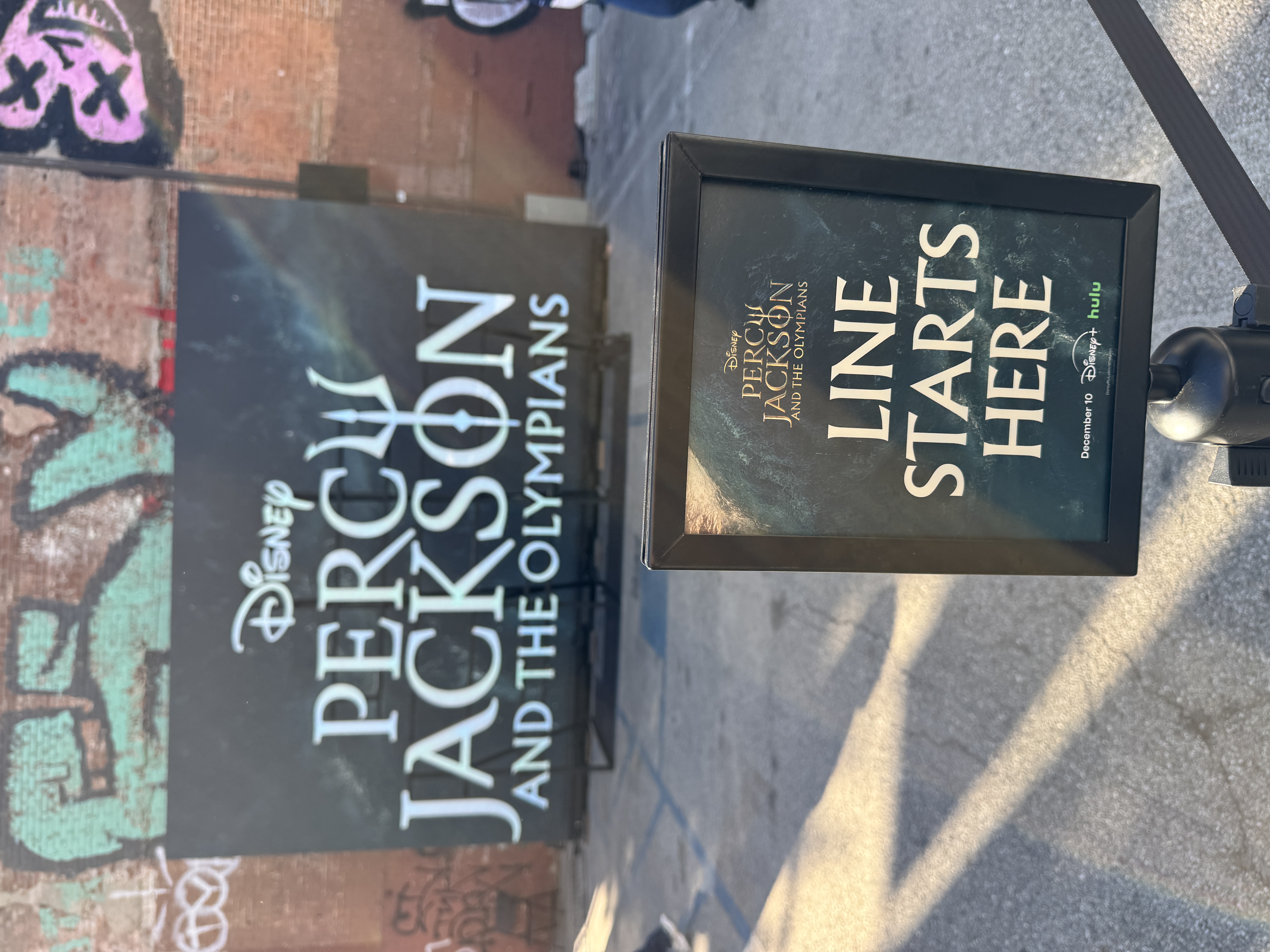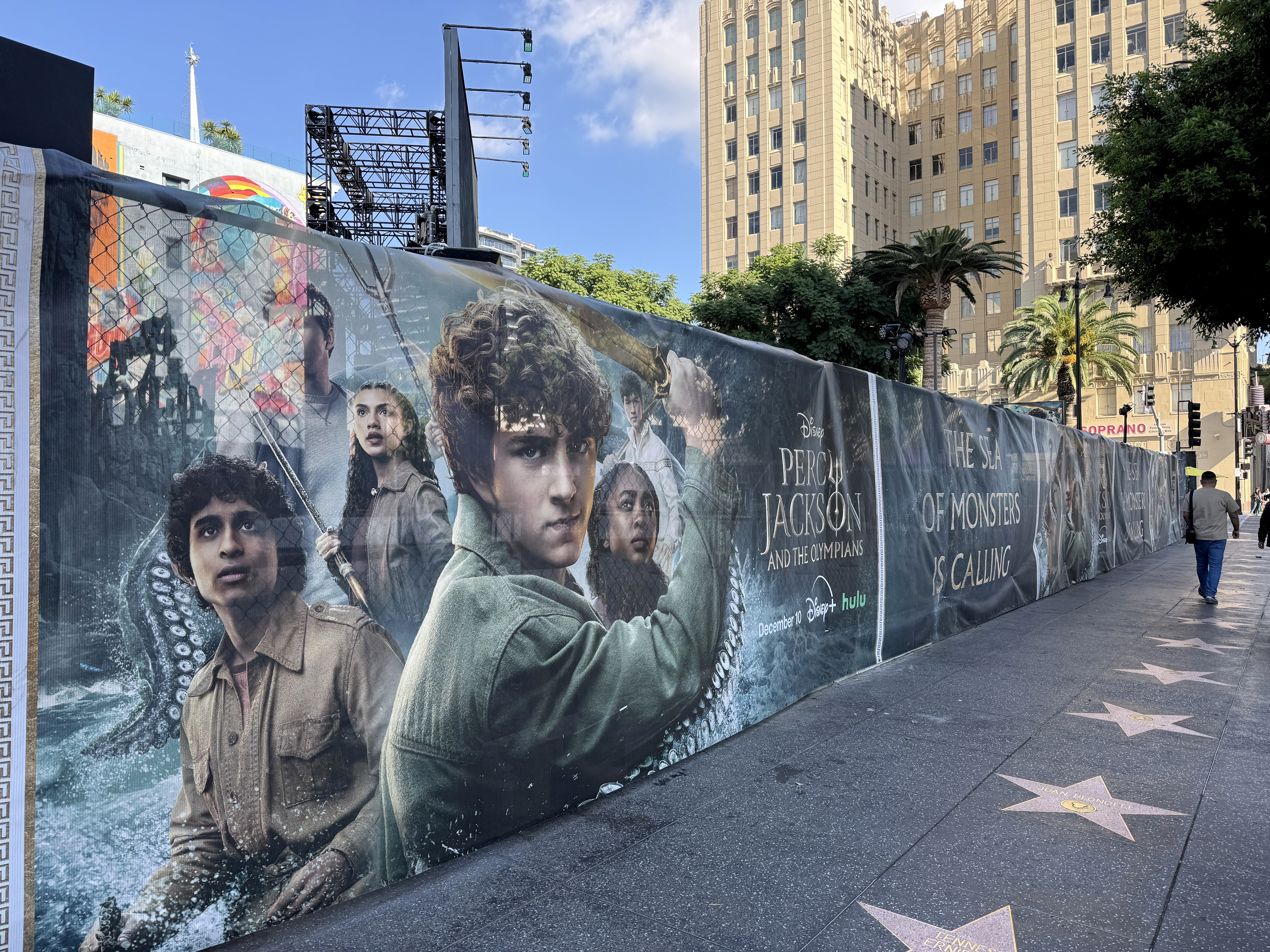 Approaching the corner of Hollywood and Vine, the Percy Jackson fun was immediately noticeable with themed scrims and billboards.