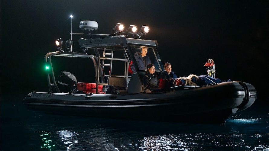 As the rescue boat hits the water filled with orcas, First Mate Jay from the Flicka suggests dumping sand into the water which will help the orcas disperse. Avery and Brooke get into a conversation about the throuple and the baby on the rescue vessel before the orcas join the party and throw everyone around. Respectfully: everyone on this show is an idiot. The orca-induced rocking adds to the patients’ pain, so they head back to The Odyssey to avoid even more pain.