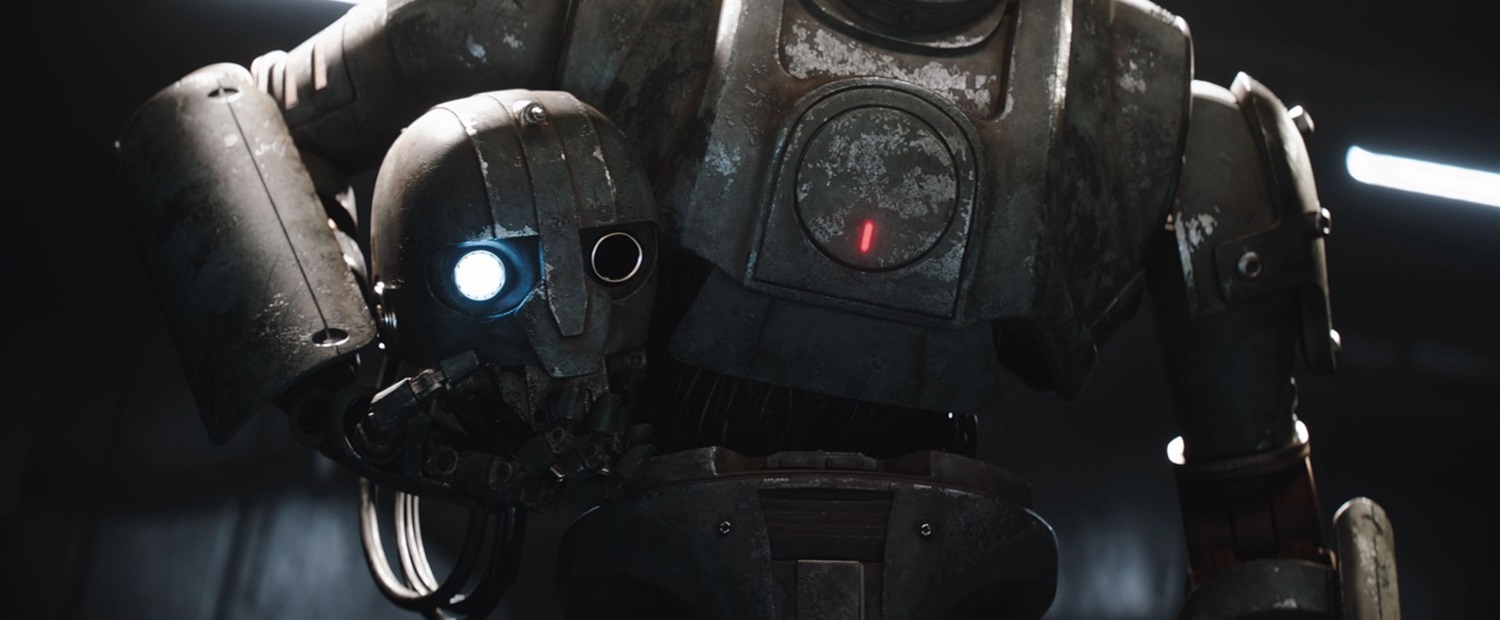 Knoll built a somewhat more complex motion-control system to shoot the Onyx Cinder ship in Skeleton Crew. It needed more complicated controls because of that ship’s rotating engines. 24 shots of the miniature made it into the finished season. They also talked about the approach to droids, specifically SM-33, for which a bunraku-style puppet was created. “It seems to work pretty well, and the paint-outs aren’t too bad." The puppet was used for 75% of SM-33’s shots (which also helps keep costs down), and the rest was accentuated by CGI. “When SM-33 is in the Onyx Cinder cockpit and driving the ship, we didn’t have a good way for the puppet to do that, so in those cases we just left the arms off and photographed the arms and torso. The arms were CGI, and in most cases I don’t think people noticed."