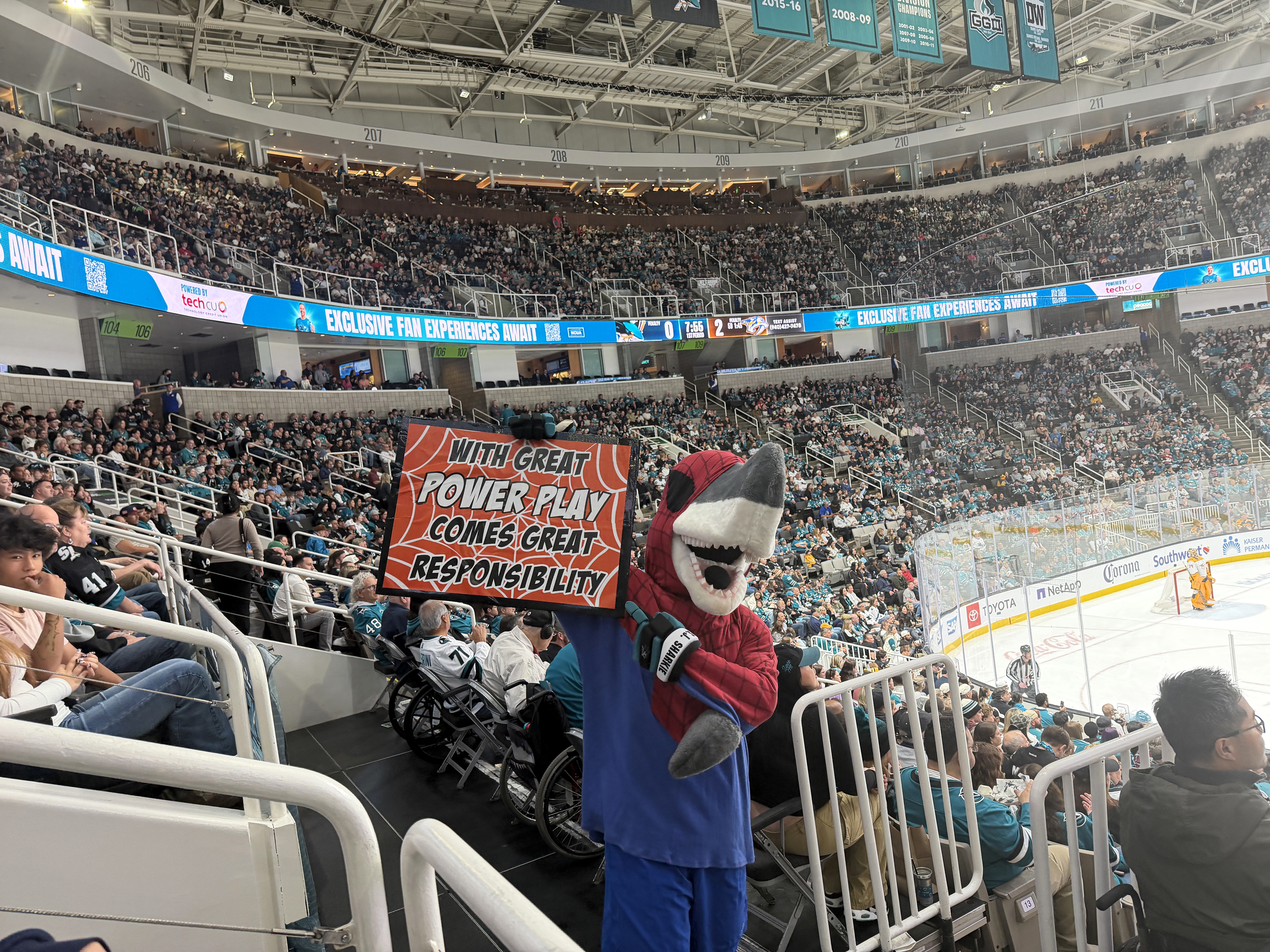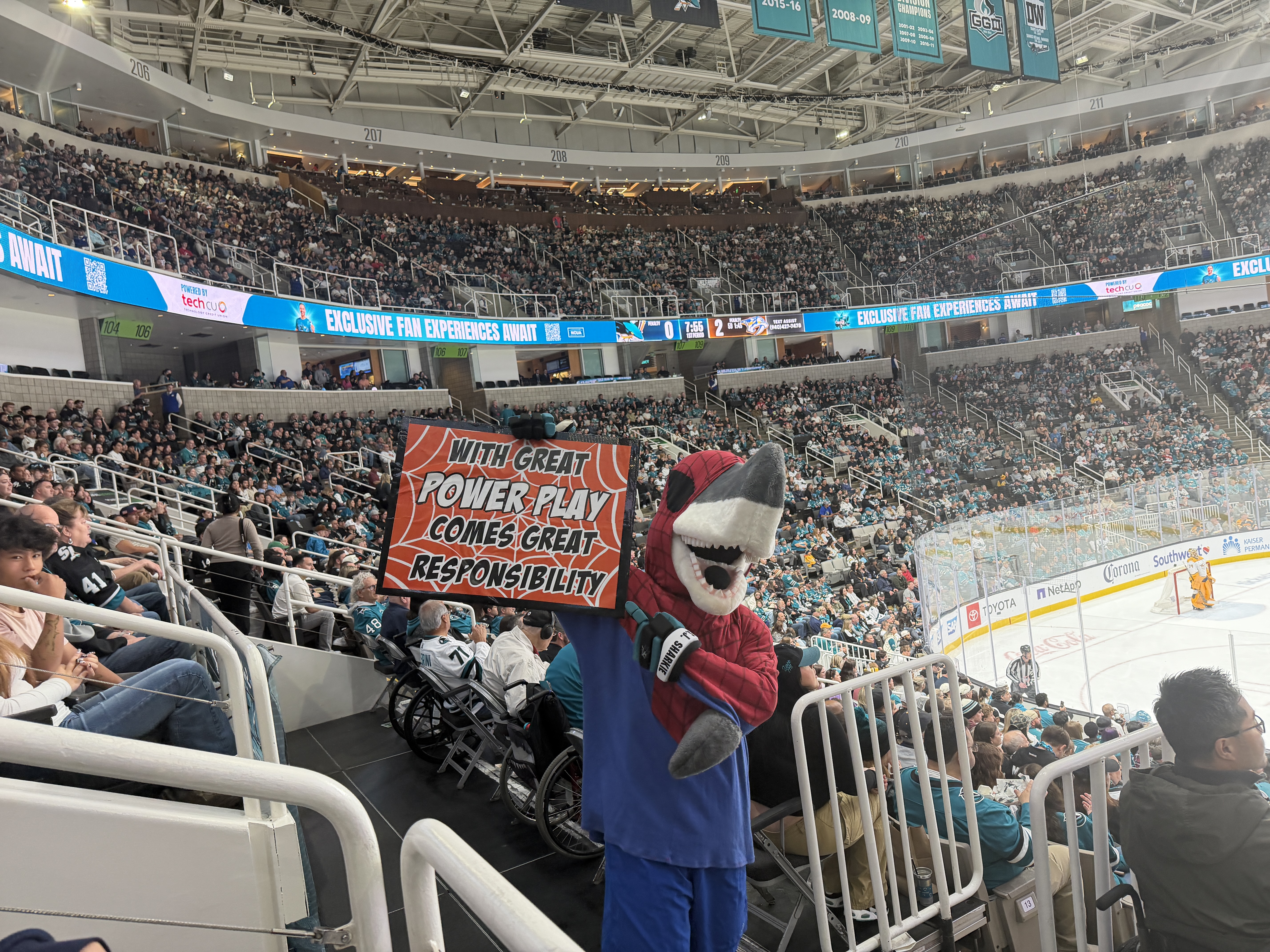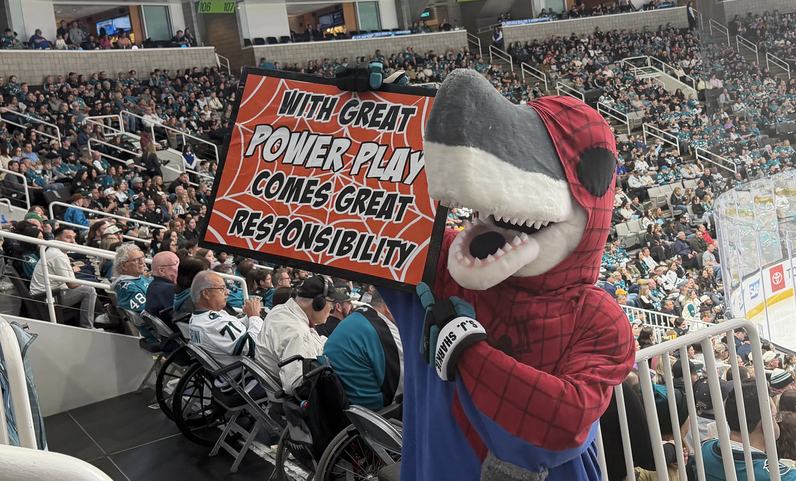 The team's mascot, S.J. Sharkie, even got dressed up in his finest Spider-Man onesie.