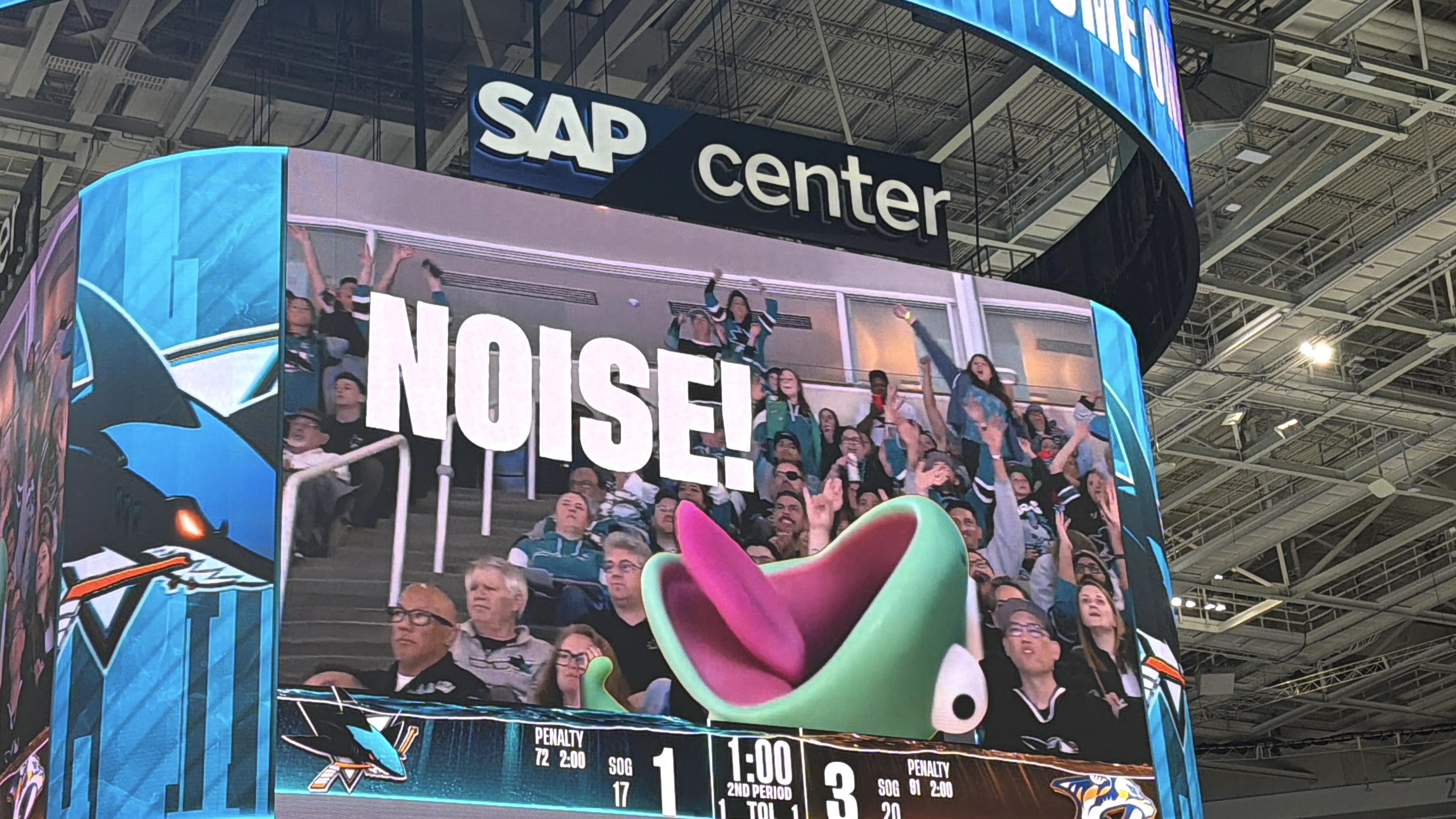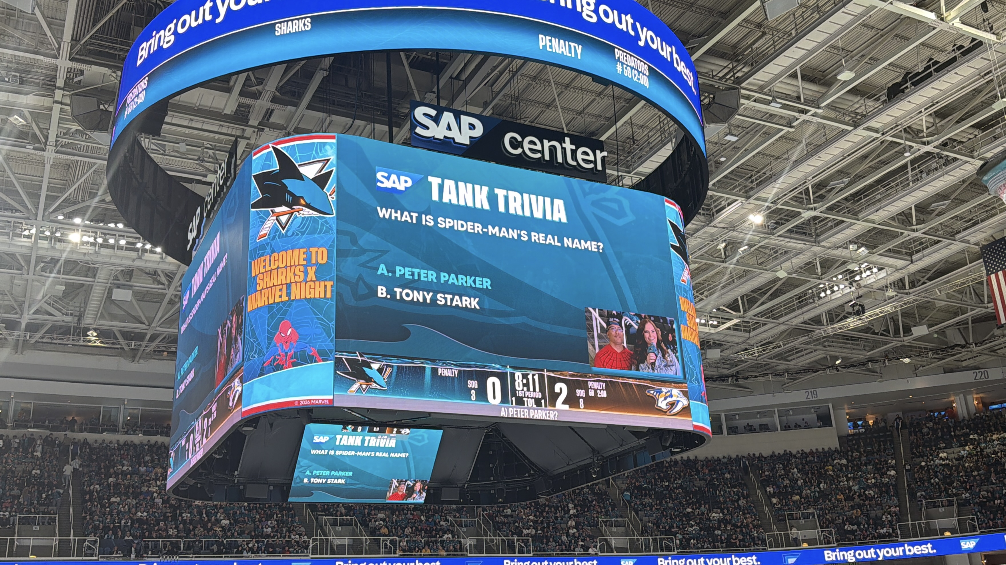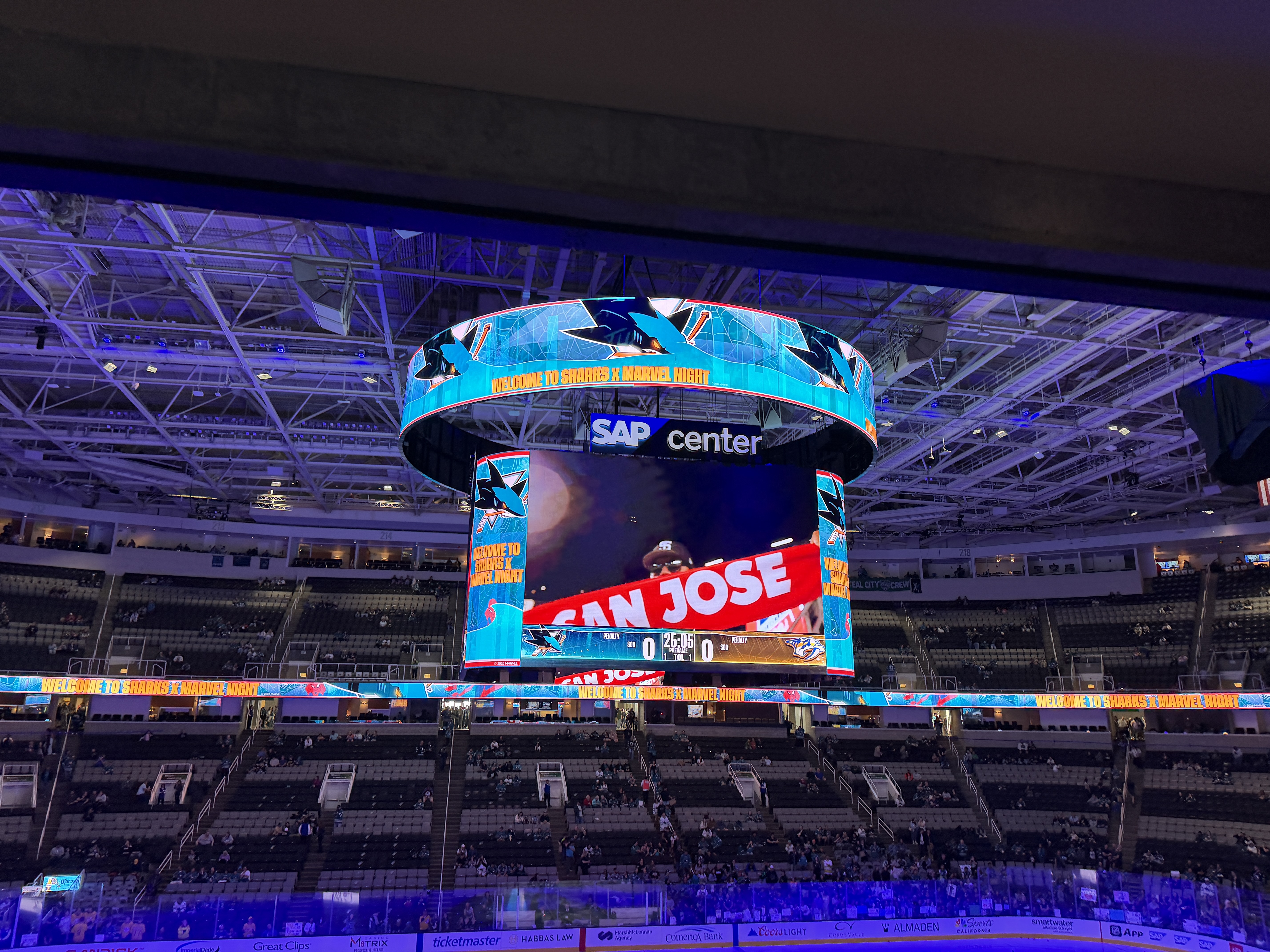 The Jumbotron welcomed hockey fans to Sharks x Marvel Night.