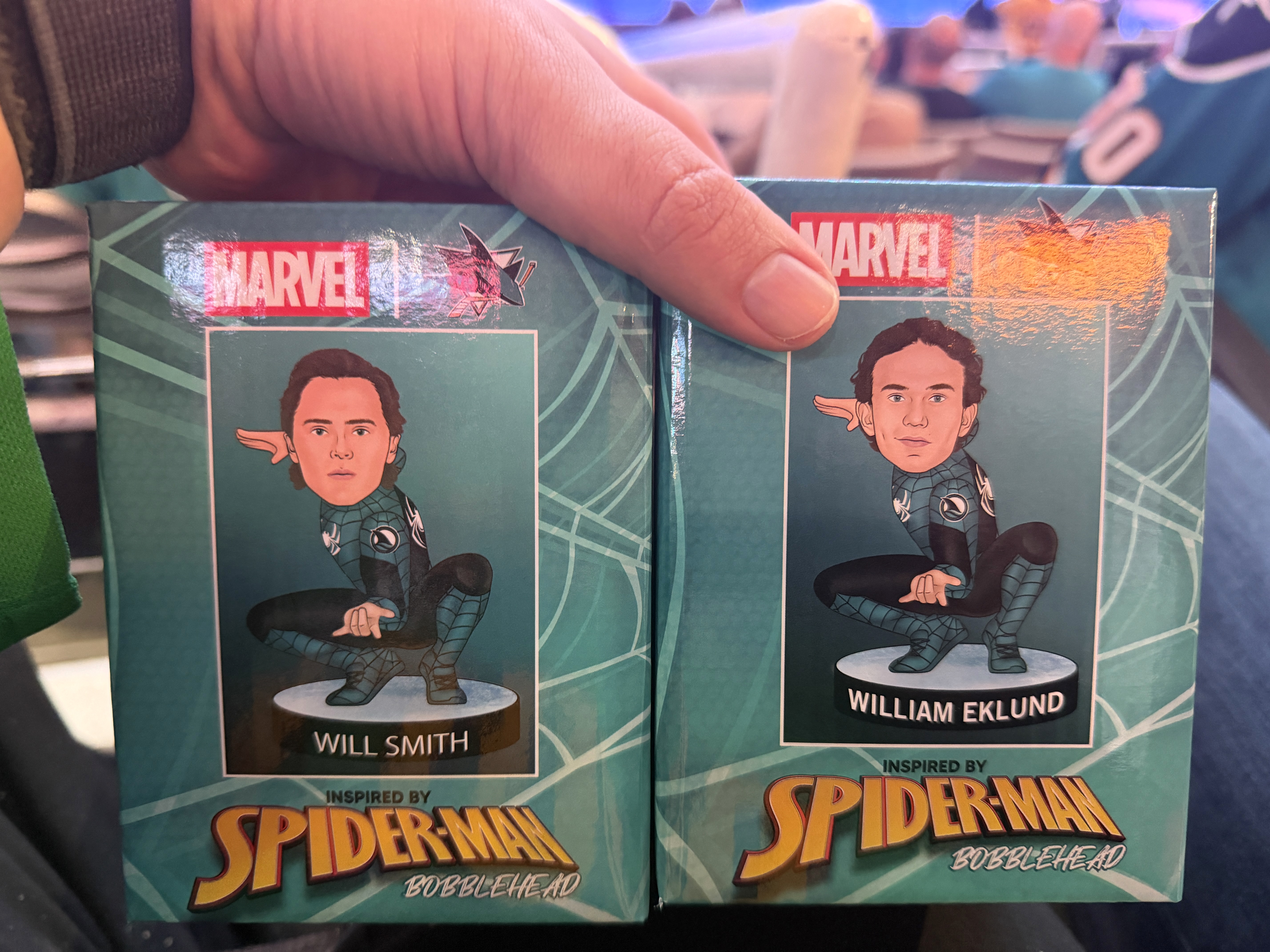 Two special Sharks x Spider-Man bobblehead figures were available, featuring players Will Smith and Will Eklund.