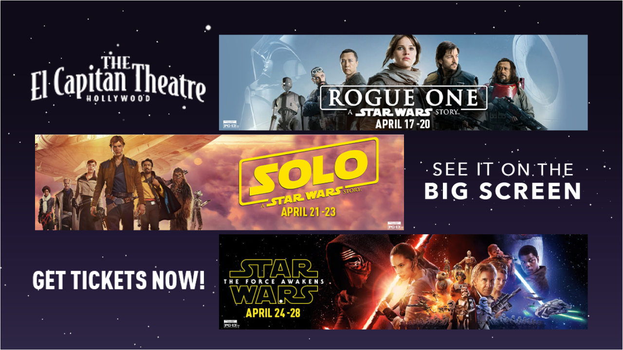 Rogue One, Solo, and The Force Awakens will screen in Hollywood this April ahead of Star Wars Day on May 4th.