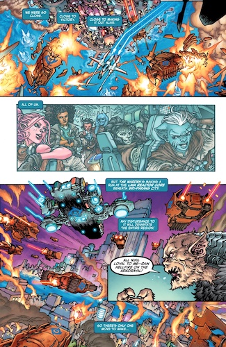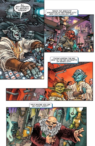 Earlier today I reviewed Marvel Comics’ Star Wars: The High Republic - Fear of the Jedi #3, which showed us the battle raging in space over the planet Eriadu, and Dark Horse’s The High Republic Adventures (2023) #17 brings us back down to the surface, where the Jedi are scrambling to defend Bri-Phrang City from the Nihil forces controlled by the villainous Warden. Jedi Knight Farzala Tarabal watches over the battlefield from an artillery command tower and makes the call to evacuate the city before the Warden can attack its lava reactor core, devastating the entire region. But the evacuation causes a bit of a panic among the citizens of Eriadu, and other Jedi like Master Yaddle have to monitor the crowds to make sure nobody gets injured in the ensuing chaos.