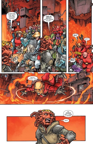 Yaddle has a conversation with Ishnar Ti-Kharatal, the former head of security for Skarabda the Hutt, and tells her to ask Farzala via communicator if there’s any other way to deal with this tumultuous situation. Here’s where we learn that Ishnar is apparently deeply in love with Farzala, and has been ever since they met on Nal Hutta many issues ago. I guess I’m sort of ashamed to admit I didn’t even remember Ishnar’s name before this point or that she and Farzala had made any sort of connection at all, so this moment fell flat for me, and the worst part is I’m not even really sure if that’s my fault or writer Daniel Jose Older’s for not making it more obvious earlier in the story. Anyway, Ishnar gives Farzala a deep, passionate speech, which only serves to trigger him falling more deeply into the vision of devastation he’s been experiencing during the battle. Chasing a figure in the distance of the burning rubble, Farzala realizes it’s his old master Obratuk, wielding a half-dozen lightsabers.