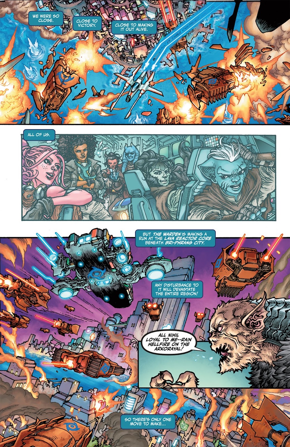 And on the final page, Farzala awakens from his vision and makes the decision to reverse his order to evacuate Bri-Phrang City, instead telling his Jedi and Republic allies to bring the fight to the air and protect the Arkorayal Cabaret Cantina at all costs. “Today we save Eriadu together!" he announces into his communicator as this issue draws to a close. I enjoyed this chapter overall (artist Harvey Tolibao’s style works best in busy, anarchic battle sequences) though I do think it was a little misleading for Dark Horse to put “The War Ends HERE!" in big capital letters on the cover, considering it ends with another cliffhanger while the Battle of Eriadu still rages on. I believe there are three issues left to go in this run, plus The High Republic Adventures - The Battle of Eriadu one-shot (which I will be reviewing next), so there’s still some story left to tell. I don’t think that’s a bad thing, and it’d be cool if Dark Horse’s marketing department didn’t either.
