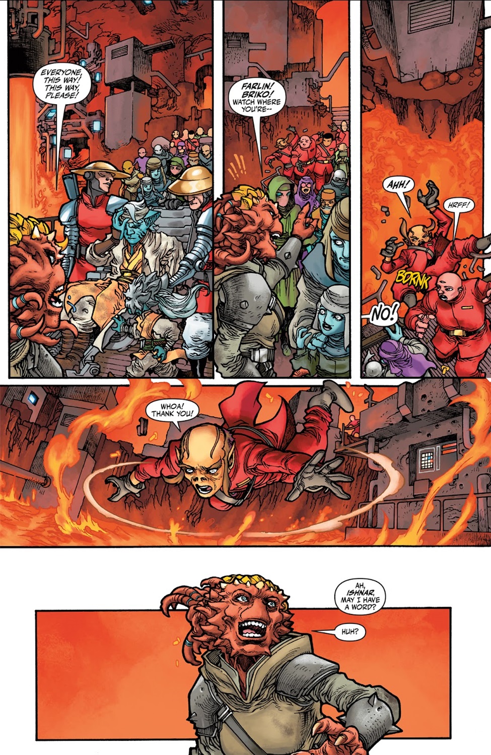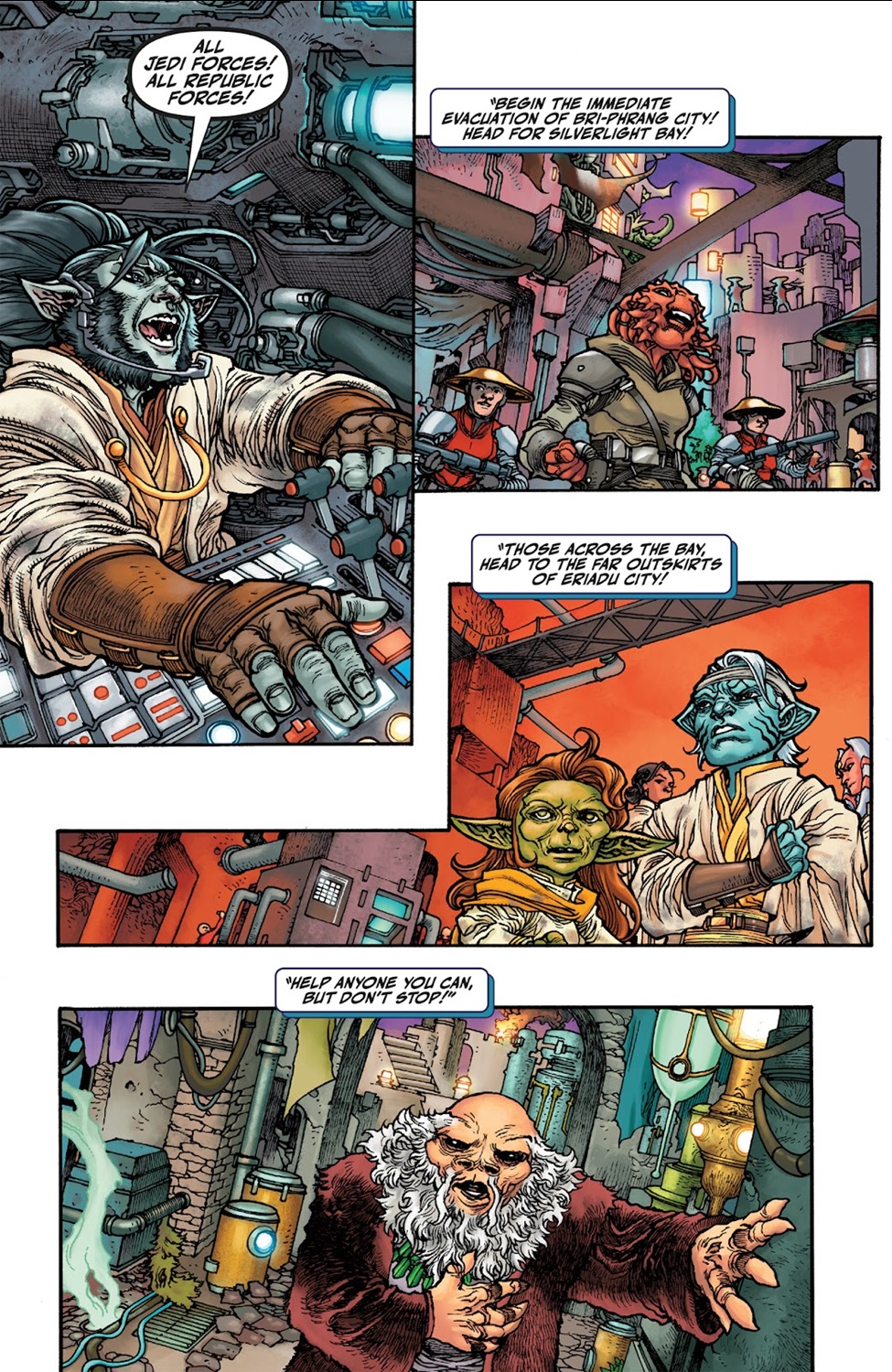 Earlier today I reviewed Marvel Comics’ Star Wars: The High Republic - Fear of the Jedi #3, which showed us the battle raging in space over the planet Eriadu, and Dark Horse’s The High Republic Adventures (2023) #17 brings us back down to the surface, where the Jedi are scrambling to defend Bri-Phrang City from the Nihil forces controlled by the villainous Warden. Jedi Knight Farzala Tarabal watches over the battlefield from an artillery command tower and makes the call to evacuate the city before the Warden can attack its lava reactor core, devastating the entire region. But the evacuation causes a bit of a panic among the citizens of Eriadu, and other Jedi like Master Yaddle have to monitor the crowds to make sure nobody gets injured in the ensuing chaos.