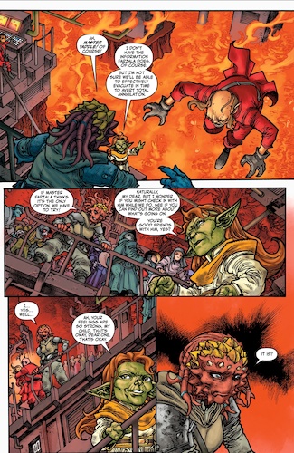 Yaddle has a conversation with Ishnar Ti-Kharatal, the former head of security for Skarabda the Hutt, and tells her to ask Farzala via communicator if there’s any other way to deal with this tumultuous situation. Here’s where we learn that Ishnar is apparently deeply in love with Farzala, and has been ever since they met on Nal Hutta many issues ago. I guess I’m sort of ashamed to admit I didn’t even remember Ishnar’s name before this point or that she and Farzala had made any sort of connection at all, so this moment fell flat for me, and the worst part is I’m not even really sure if that’s my fault or writer Daniel Jose Older’s for not making it more obvious earlier in the story. Anyway, Ishnar gives Farzala a deep, passionate speech, which only serves to trigger him falling more deeply into the vision of devastation he’s been experiencing during the battle. Chasing a figure in the distance of the burning rubble, Farzala realizes it’s his old master Obratuk, wielding a half-dozen lightsabers.