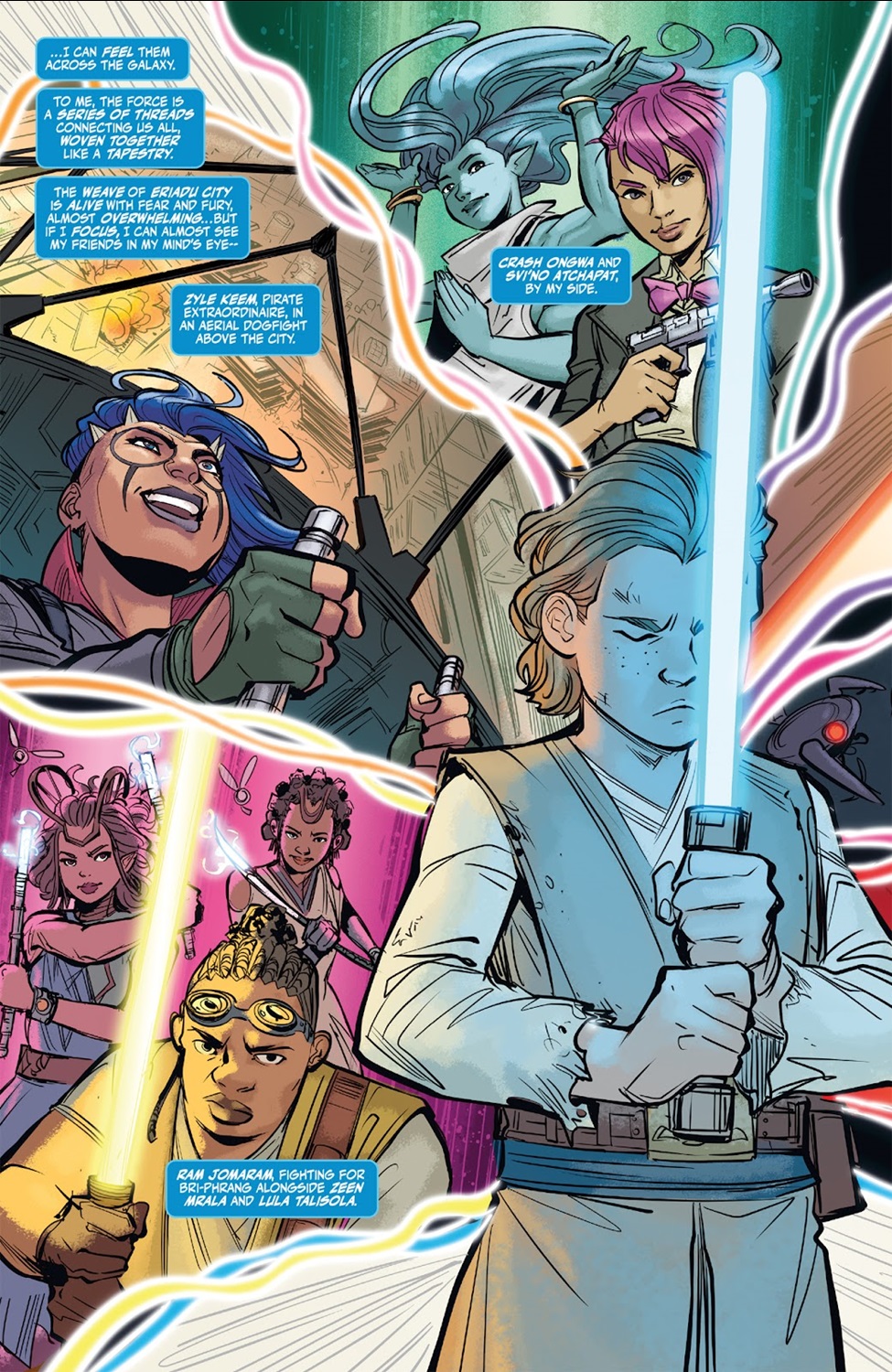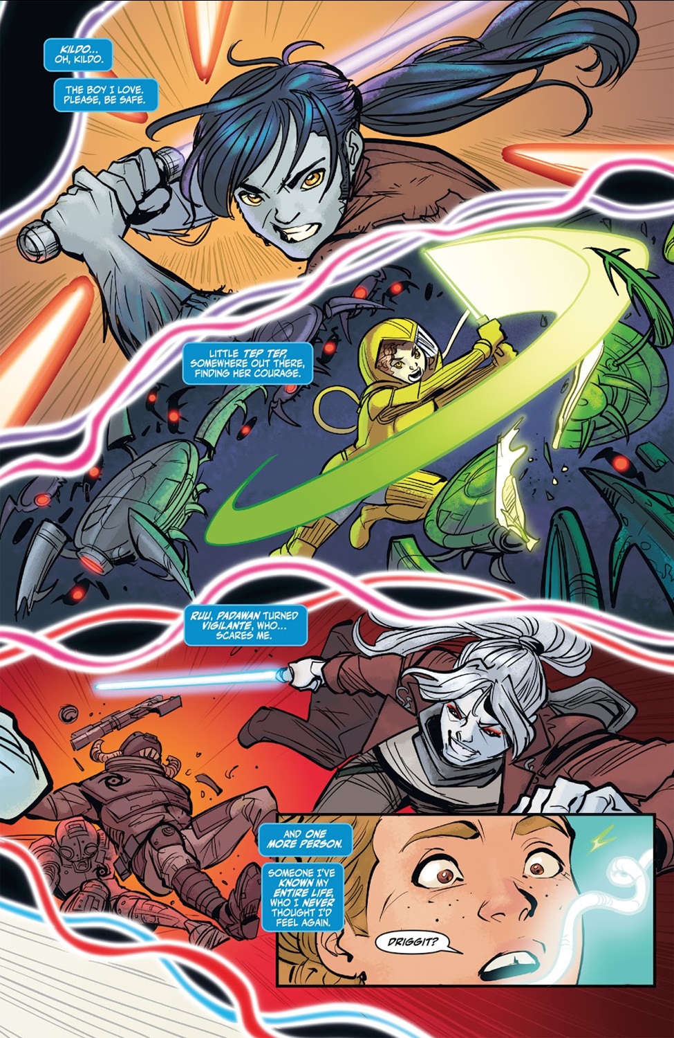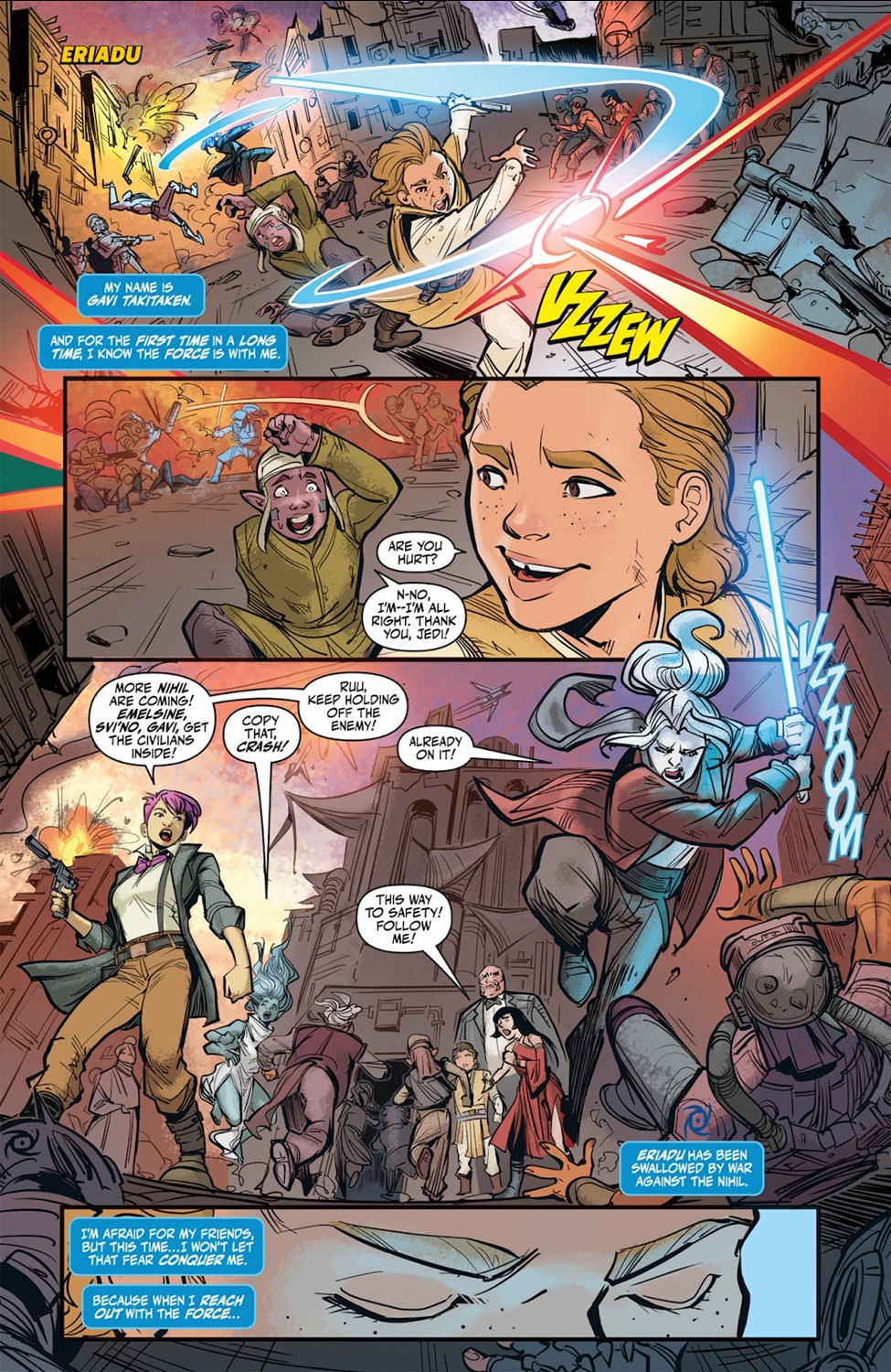 The High Republic Adventures - The Battle of Eriadu one-shot begins on the surface of the titular planet, with Jedi Initiate Gavi Takitaken fighting the Nihil alongside security expert Alys “Crash" Ongwa (who happens to be named after this issue’s writer Alyssa Wong), Padawan Ruu, and singer Svi’no Atchapat, all of whom were introduced in previous The High Republic novel or comic releases. As Gavi deflects Nihil blast bolts away from innocent bystanders, he feels in the Force– which he perceives as a series of threads– for his friends and allies, including pirate Zyle Keem, fellow Jedi Initiates Kildo (who Gavi is in love with, we are reminded) and Tep Tep, Padawan Ram Jomaram, and ex-Jedi Lula Talisola, who has just recently married the Force-sensitive non-Jedi Zeen Mrala. That’s a lot of characters to keep track of– and you don’t know the half of it if you haven’t been reading the rest of The High Republic– but the important one for this issue is the final person Gavi senses: his old friend Driggit Parse.