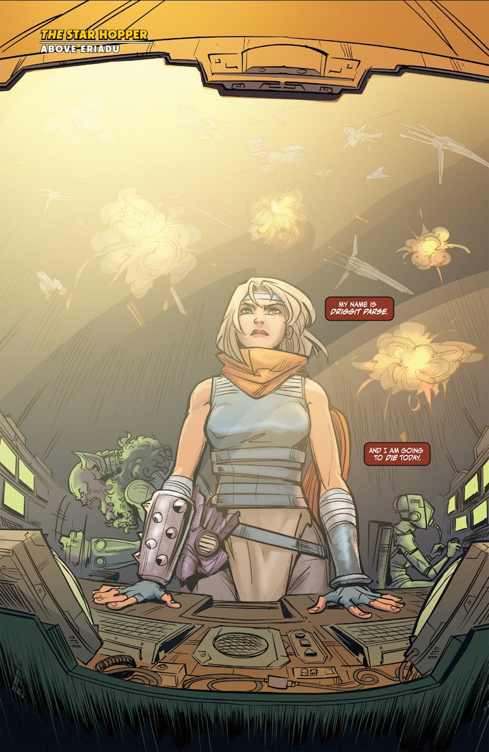 And here’s where Driggit reveals the final step in her plan: just as the Eviscerators are about to unleash destruction on Eriadu City, she presses the button on a remote which destroys them all, ending the threat these vehicles posed and announcing to the Warden that she had provided him with fake, sabotaged blueprints for their design. Then she helps Gavi and Ruu defend some civilians against further Nihil attacks, but when the dust settles from that she finds herself explaining to her friend why she can’t stay with him or return to Valo– she doesn’t feel that she will ever be accepted back into society after working with the Nihil for so long. Of course Gavi feels the opposite is true, but Driggit doesn’t listen, tossing a thermal detonator as a distraction and disappearing into the rubble wearing a mask.
