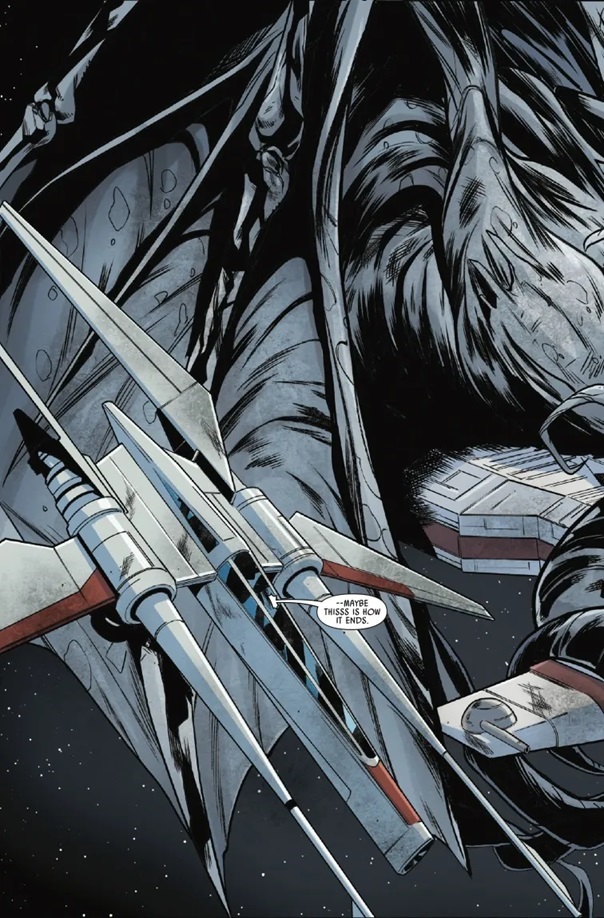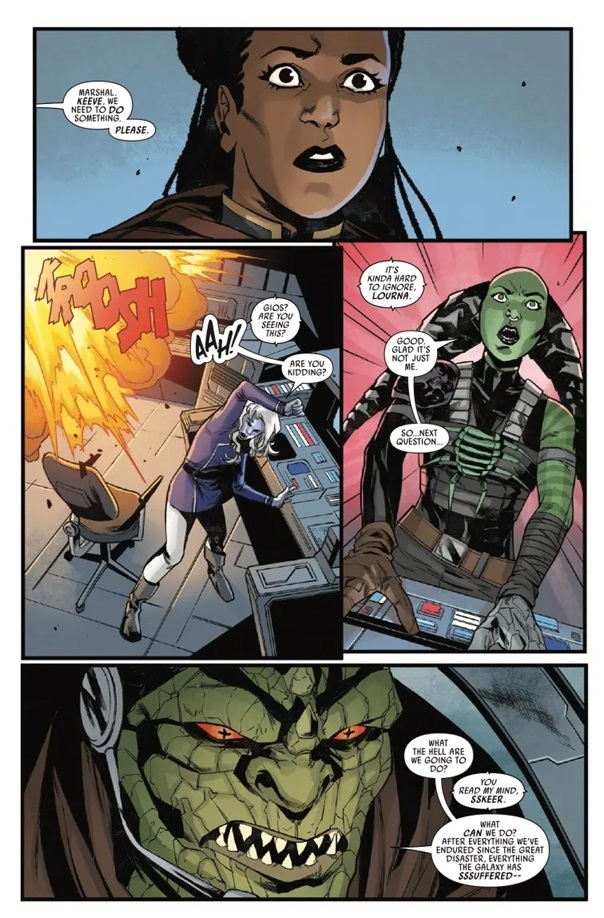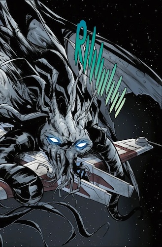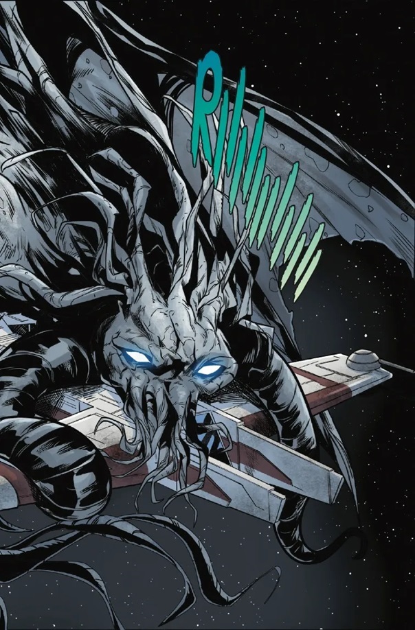 The High Republic - Fear of the Jedi #4 begins aboard the Republic Longbeam cruiser Gios, where Marshal Keeve Trennis is stunned by the sudden appearance of never-before-seen enormous, winged versions of the Force-eating Nameless creatures out in space. In neighboring ships, Lourna Dee and Sskeer are similarly shocked, and the latter of those two almost seems ready to give up for good. But after the Nameless tears open the hull of the Gios, Keeve uses the Force (simultaneously wondering why she’s able to do that if a huge Nameless is just outside) to halt the danger of decompression in the vessel’s hull, while the other crew members scramble to raise a containment field. Out in space, Jedi Knight Ai-dan Yelooc and Masters Sskeer and Orbalin attempt to combat the Nameless with their Vector starfighters, though another divided part of Orbalin’s gelatinous form is soon killed by one of the creatures.