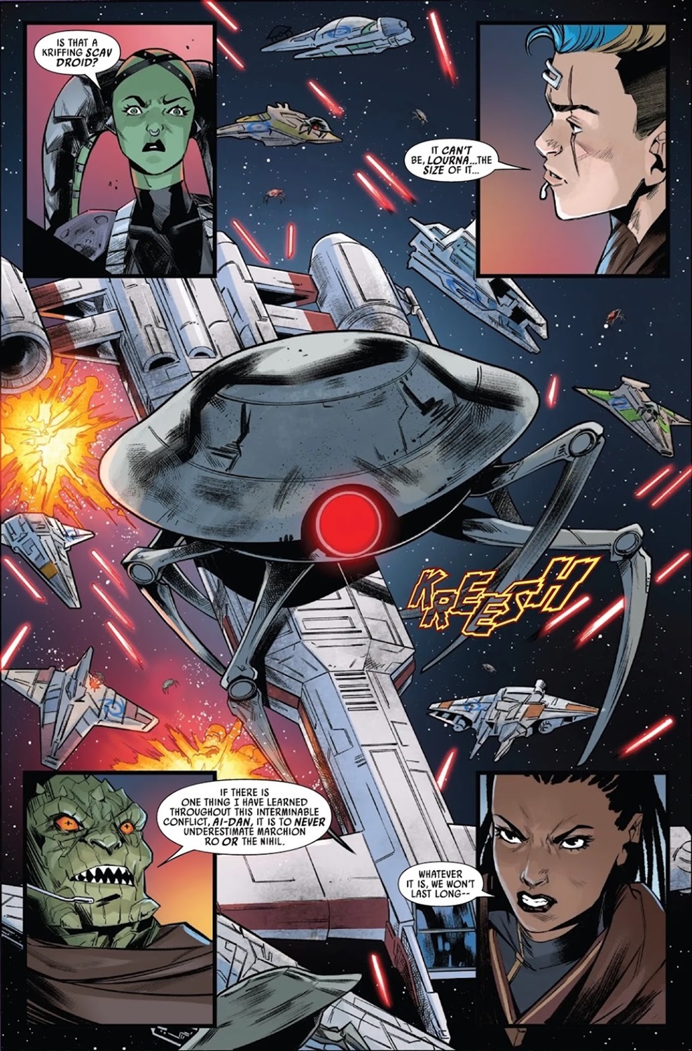The High Republic - Fear of the Jedi #5 opens in orbit around the planet Eriadu, where the climactic battle of the Republic’s war against the Nihil is still taking place. At the end of the previous issue, a giant scav droid was revealed to be the source of the destruction of the Longbeam cruiser Gios (with the Child of the Storm H’Tar having disguised it as the Jedi’s worst fear– an enormous Nameless creature). So Jedi Master Sskeer pilots his Vector starfighter in a direct attack on the droid, while even more Nihil ships emerge from hyperspace and enter the conflict. But when Marshal Keeve Trennis realizes that the Nihil retain the ability to communicate with each other despite all other transmissions being blocked, she comes up with a plan to infiltrate the giant droid and hack into the broadcast system with the help of GoNet reporter Rhil Dairo.