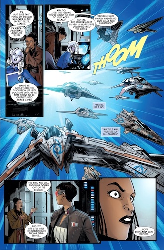 I’m not sure that I entirely understand the geography of how Keeve and Rhil enter the droid, but either way this plan leads to Trennis making a speech to the galaxy at large urging all of its citizens to rise up against the Nihil… this scene brought to mind the recent Andor: A Star Wars Story episode showcasing Mon Mothma’s moving tirade in opposition to Emperor Palpatine, so let’s hope for the Republic’s sake that it’s similarly effective. Meanwhile on Lourna Dee’s ship the Tempest Breaker, a vision of H’Tar appears on the bridge and enters into conversation with her former brother among the Children of the Storm, Cibaba. Despite the battle still raging outside the ship, Cibaba becomes convinced that H’Tar can still be saved from her involuntary service to Marchion Ro and the Nihil. Thankfully at this point more Republic ships arrive on the scene, with Wookiee Jedi Master Kelnacca, the Mon Calamari fleet, and even members of the Togruta and Hutt species pitching in against their common enemy.
