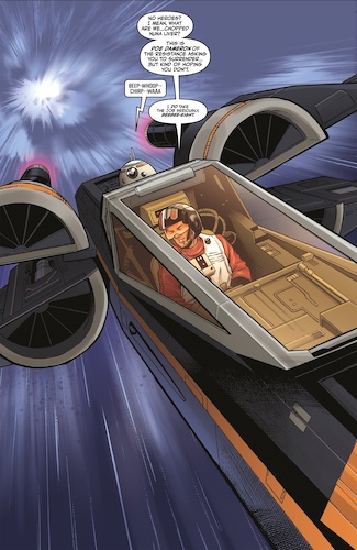 Anyway, after returning from this somewhat-unsanctioned rescue, Poe is approached by General Leia Organa (Wookieepedia informs me that this comic is set between issue #25 of Marvel’s Star Wars: Poe Dameron comic and The Force Awakens) about another secret mission: apparently the ever-expanding First Order has figured out a way to decrypt encoded Resistance messages and that method is housed on the Hutt-controlled planet of Nar Kaaga. So it’s up to Dameron, accompanied by his old pal and fellow Resistance pilot Temmin “Snap" Wexley– along with BB-8 and a few other X-wing pilots– to track down and destroy what they assume to be a codebreaking machine of some type. But because Poe’s usual starfighter is damaged from that previous task, he’s forced to take a different X-wing, which turns out to be good luck later on.