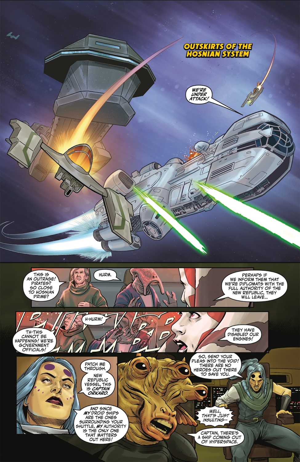 Hyperspace Stories - Codebreaker #1 kicks off with a New Republic transport ship carrying government officials under attack by pilots, and Poe Dameron’s black X-wing starfighter screaming into action out of hyperspace with his trusty droid BB-8 along for the ride as usual. Right off the bat I can tell that writer Ethan Sacks (Star Wars: Bounty Hunters) has a near-perfect grasp on the voice of Poe’s character and the tone of the Star Wars sequel trilogy in general, as the character trades pointed barbs with the pirates while disabling their ships one-by-one. I also found myself immediately impressed with the art by penciller Marc Yarza (Werewolf Frankenstein), inker Jose Marzan Jr. (The Uncanny X-Men), and colorist Nicola Righi (Star Wars: The Rise of Kylo Ren). The likenesses are great but never resort to carbon-copies of poses we saw in the movies, and the action is engaging and exciting throughout.