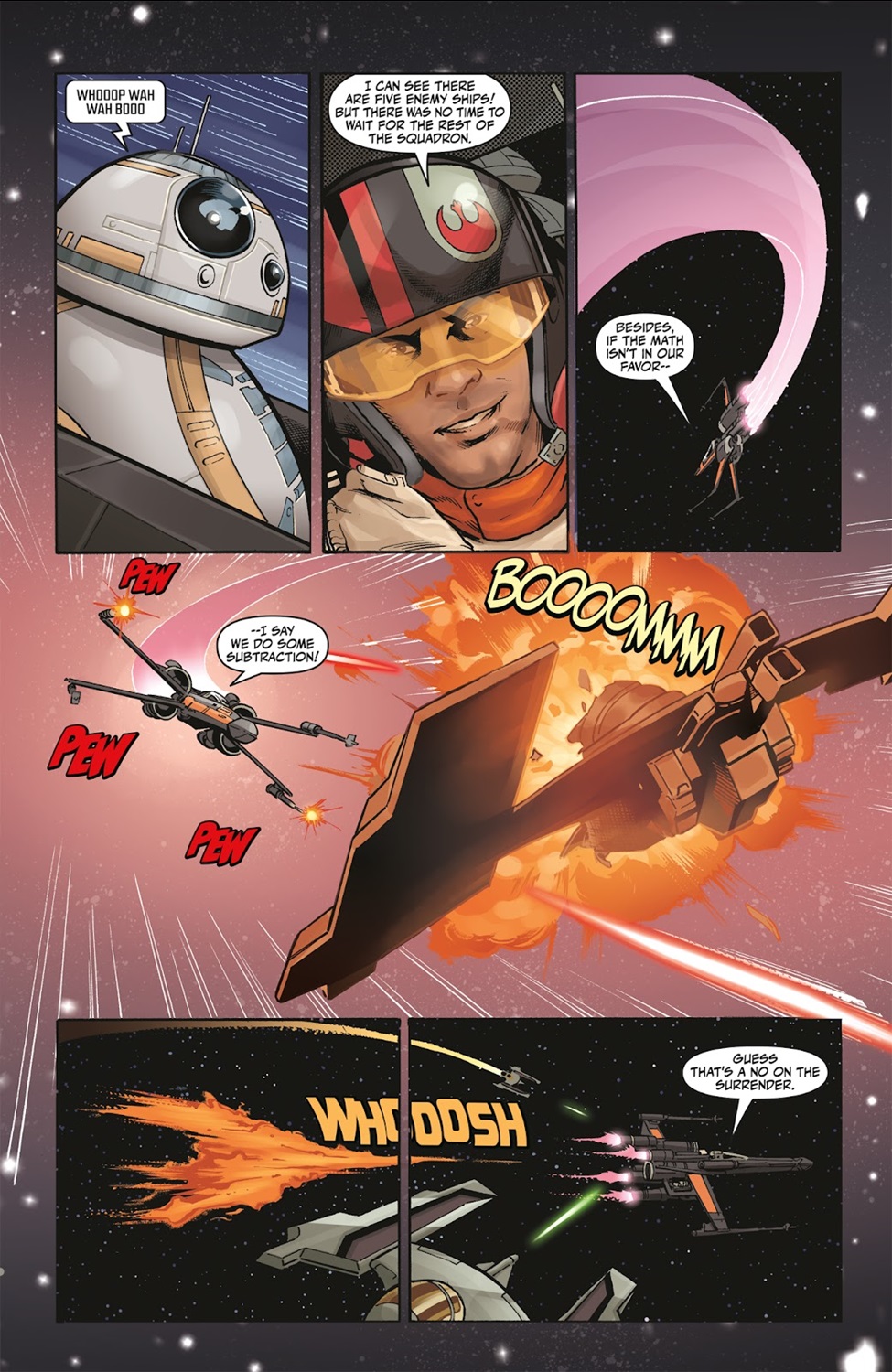 Anyway, after returning from this somewhat-unsanctioned rescue, Poe is approached by General Leia Organa (Wookieepedia informs me that this comic is set between issue #25 of Marvel’s Star Wars: Poe Dameron comic and The Force Awakens) about another secret mission: apparently the ever-expanding First Order has figured out a way to decrypt encoded Resistance messages and that method is housed on the Hutt-controlled planet of Nar Kaaga. So it’s up to Dameron, accompanied by his old pal and fellow Resistance pilot Temmin “Snap" Wexley– along with BB-8 and a few other X-wing pilots– to track down and destroy what they assume to be a codebreaking machine of some type. But because Poe’s usual starfighter is damaged from that previous task, he’s forced to take a different X-wing, which turns out to be good luck later on.