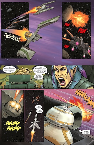 Arriving in orbit around Nar Kaaga, the squadron receives a message from a New Republic governor who warns them about endangering a treaty with the Hutts, but before they can take that advice into account they are attacked by an ace First Order pilot known as the Banshee of Bestine. Several of the “red shirt" X-wings are destroyed and Poe sends Snap back for reinforcements before faking a crash-landing on the planet’s surface to evade the Banshee. He and BB-8 hike into Nar Kaaga City and meet up with their contact, an old friend from his smuggling days named Groshank Survell (newly introduced here). From there Dameron must don a First Order officer’s uniform as a disguise and sneak into a nearby base, where he soon discovers that the codebreaking target of his mission is not a machine at all, but rather an alien child.