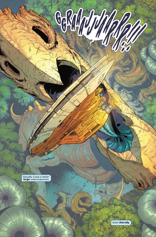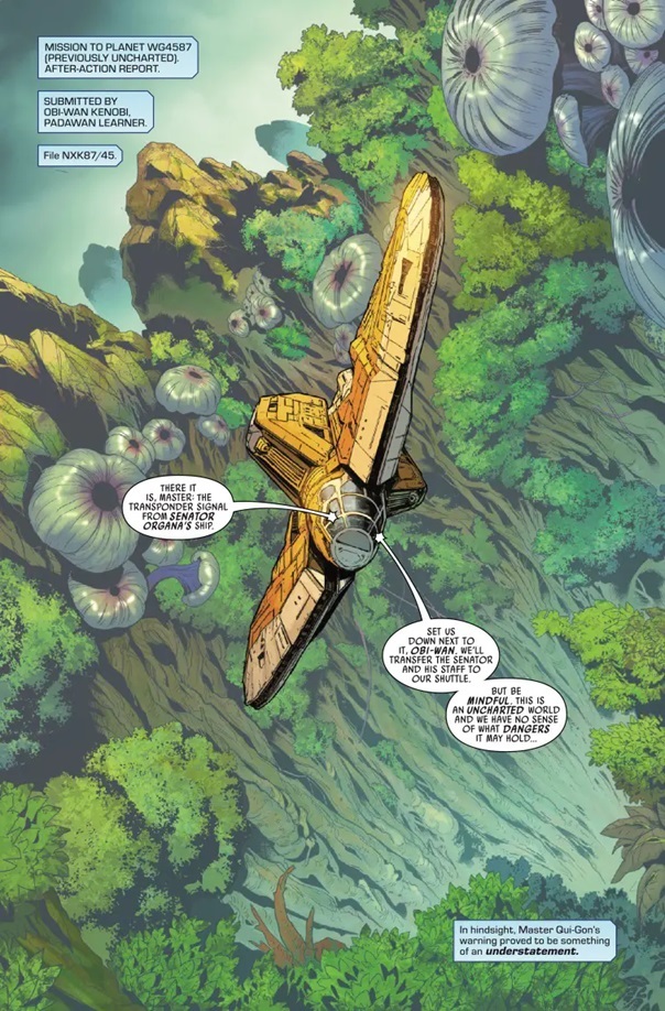 Jedi Knights #3 begins with Jedi Master Qui-Gon Jinn and his Padawan learner Obi-Wan Kenobi arriving at the planet WG4587 (apparently designated with an alphanumeric code because it was previously uncharted) in a T-6 shuttle like the one we see Ahsoka and Huyang piloting in Lucasfilm’s live-action series Star Wars: Ahsoka. Their mission is to rescue Junior Republic Senator Bail Organa and his staff, who transmitted a distress call from the planet after crash-landing there. So the interesting thing right off the bat about this issue is that it’s entirely made up of splash pages, which is to say that the pages are not broken up into smaller panels, instead conveying the action in one big frame on every page.