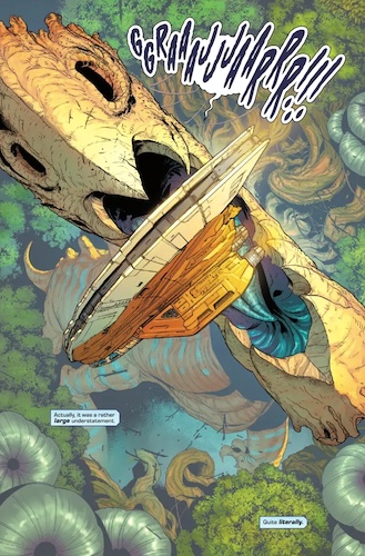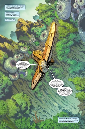 That’s a unique way of telling a story in the comics medium, and while I’m sure it’s been done before I don’t think I’ve ever encountered it in Star Wars. It also gives the writer (Marc Guggenheim, in this case) less overall real estate for narrative and dialogue, since there are exactly as many panels as there are pages in a standard issue. Upon arriving at WG4587, Qui-Gon and Obi-Wan encounter giant, aggressive creatures called Kaijura (get it?). I guess I’m a little confused as to how the Republic and/or the Jedi knew the name of the indigenous species if the planet was uncharted, but I suppose that’s neither here nor there. At first the two Jedi must escape the jaws of one of these enormous beasts, and then Qui-Gon is forced to carry an unconscious Obi-Wan further into the jungle in search of the nearby source of Organa’s transponder signal.