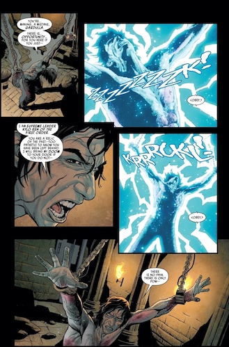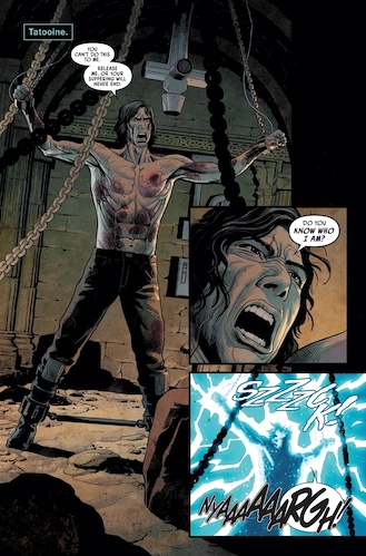 Legacy of Vader #3 begins with Kylo Ren being held captive in the dungeon of Gardulla the Hutt, who he had attempted to murder in the previous issue. Kylo screams for his release, but is met only with repeated shock via wires that are connected through his chains. In the midst of his torture, Kylo sees a vision of his encounter with Rey at the end of Star Wars: The Last Jedi, and then he insists to Gardulla that the First Order will come seeking him since he’s been missing for days. “Days? Do you think so?" replies Gardulla. “Oh, little worm… it’s barely been an hour." We see Gardulla’s still-unidentified pet Force-wielder examining Kylo Ren’s lightsaber, and it advises the Hutt not to Kill Ren: “If he dies, you probably do too." So Gardulla gives Kylo a reprieve from the electric shocks, instead gassing him into having more visions– this time of his grandfather Darth Vader cutting down a battalion of Rebel Alliance soldiers.