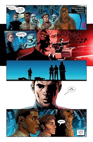 Still, Houser and Sliney continue to make the best of the uneven source material they’re working with here, and I’ll add additional praise to the artist for making such interesting choices with his interpretation of the scenes that play out in this chapter. On Houser’s part, we do get another added conversation (not contained within the body of the film) between Resistance technician Rose Tico and General Leia Organa about the Final Order and its fleet, plus some new lines of dialogue that– thankfully– make it more clear what Finn wanted to tell Rey, and what his relationship with the Force might be. We also get to see a flashback of Jannah in her First Order stormtrooper armor and a vision Rey has of Darth Vader dueling his son Luke Skywalker in the second Death Star’s throne room, but the rest is a fairly straightforward adaptation of the movie, which is fine and works well enough.
